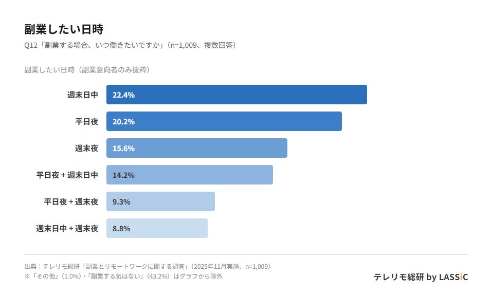 副業したい日時:「週末日中」22.4%が最多、「平日夜」20.2%が続く
