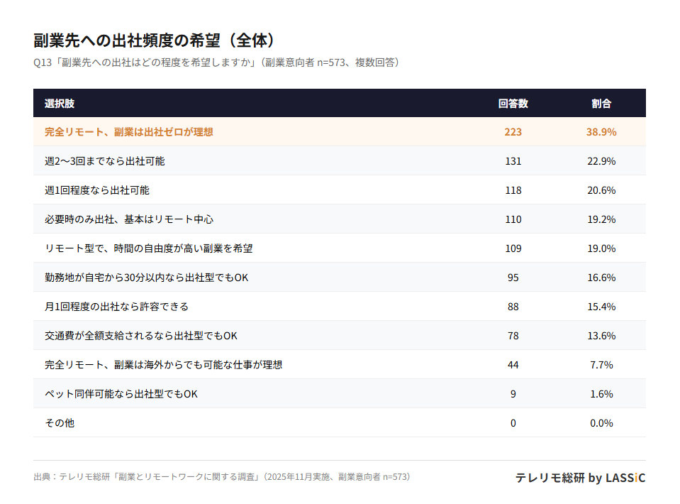 副業意向のある573人に副業先への出社頻度の希望を質問したところ、全体では「完全リモート、出社ゼロが理想」が38.9%で最多だった