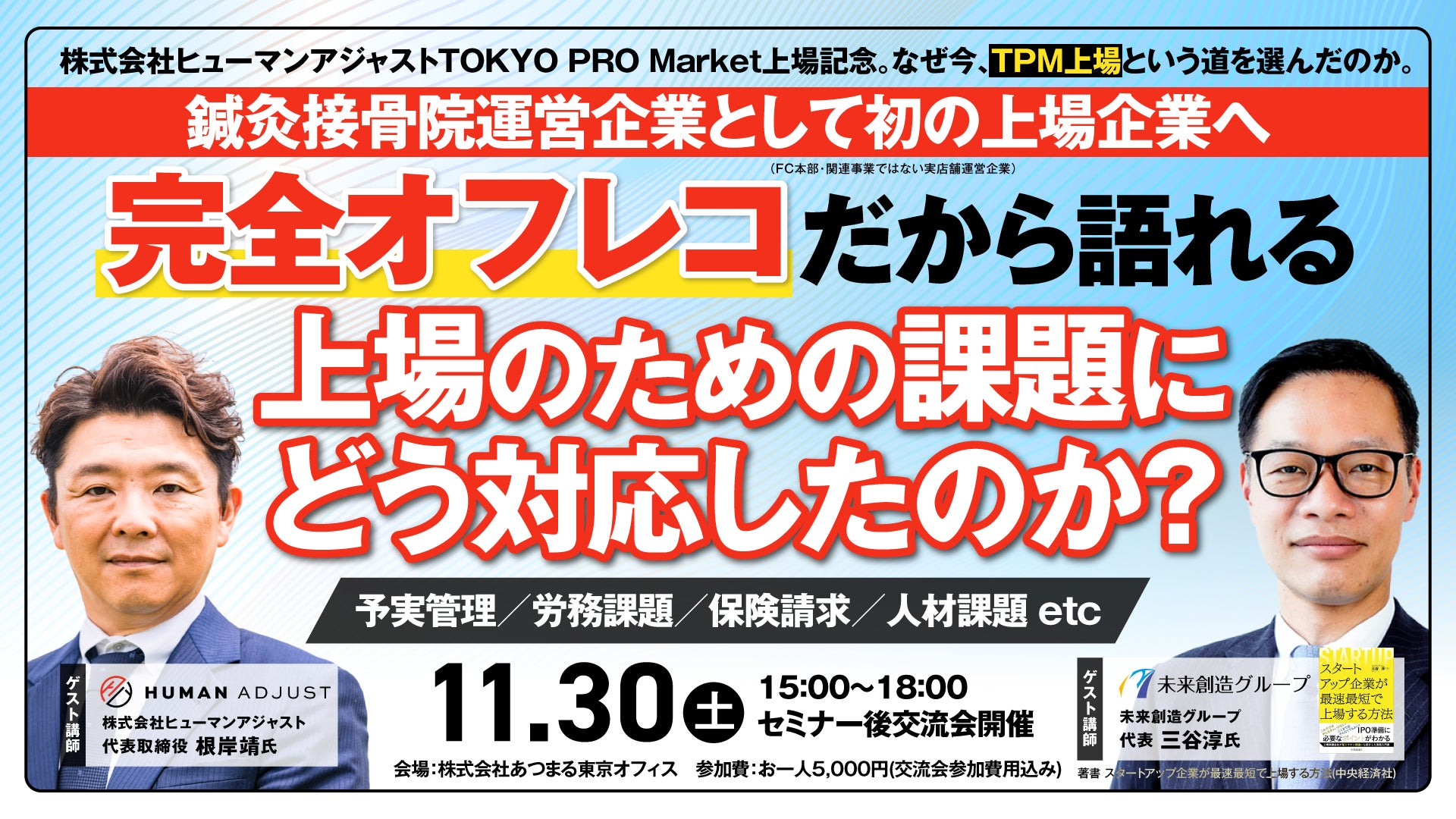株式会社あつまる(所在地:東京都渋谷区・福岡市中央区)では、2024年11月30日(土)に、東京本社にて、鍼灸接骨院運営企業としては、TOKYO PRO Market(TPM)で初の上場企業となる、株式会社ヒューマンアジャスト様をお迎えして、上場記念セミナーを開催いたします。