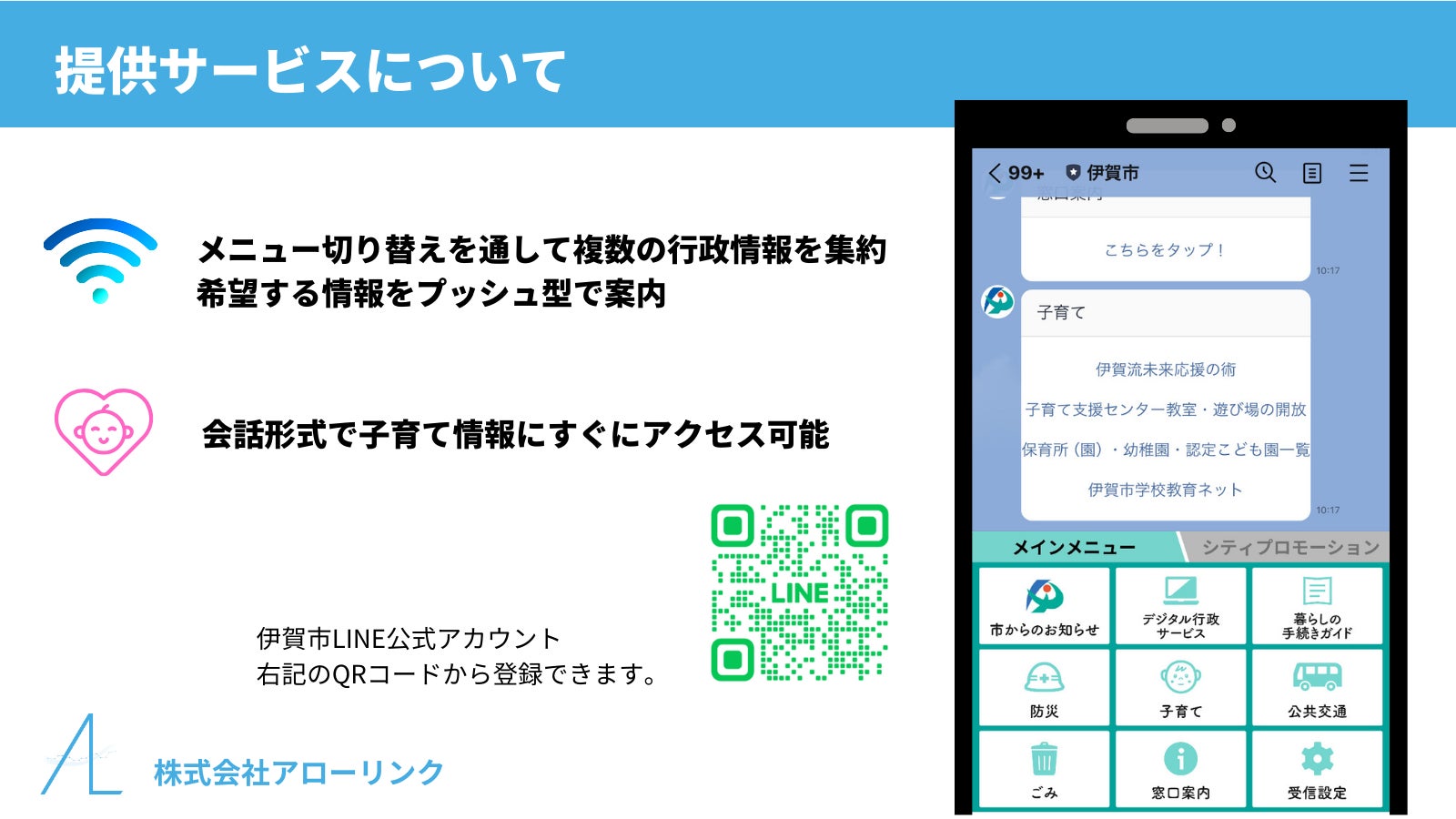 伊賀市LINE公式アカウントは、市民の皆様の利便性向上を目指し、多くの情報を集約する媒体の構築とプッシュ型通知の実現を目指しております。