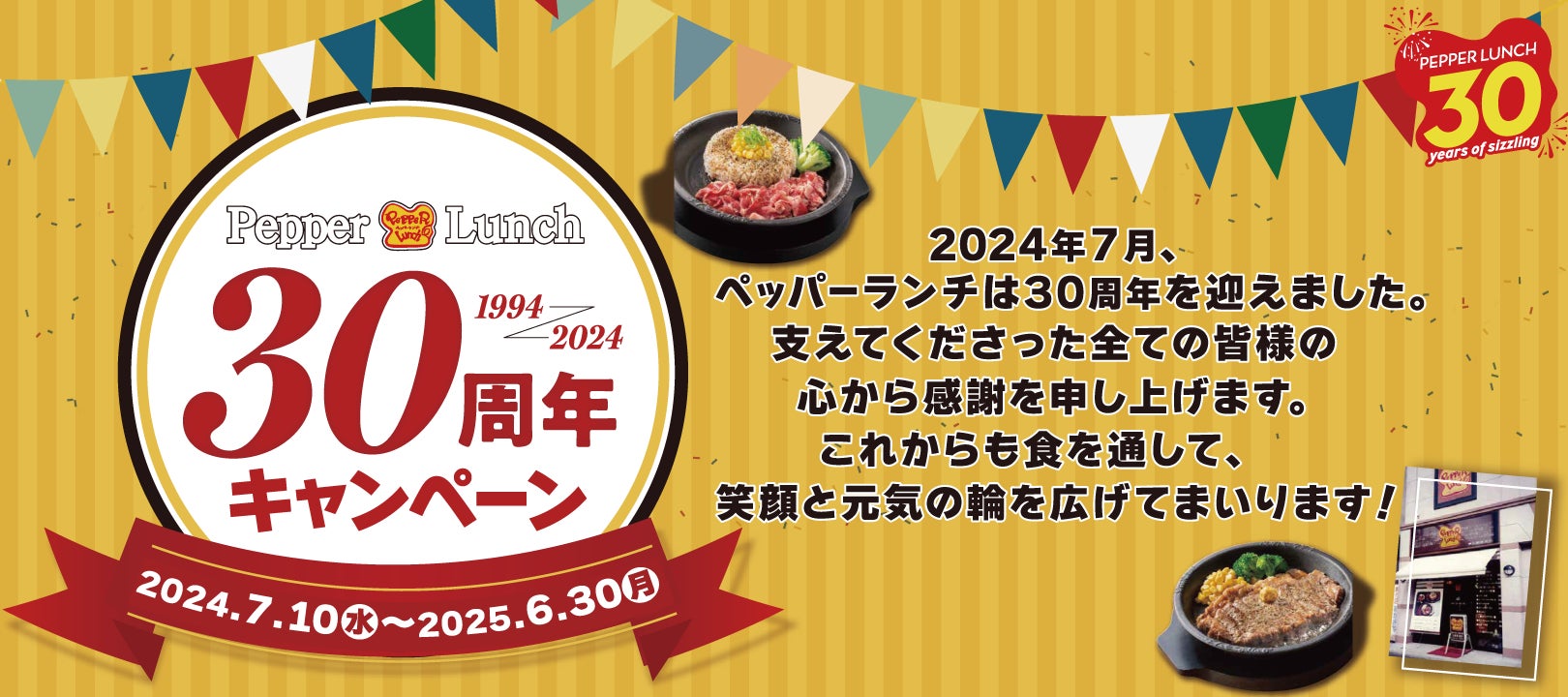 ペッパーランチは1994年7月3日に神奈川県大船に1号店をオープンいたしました。この30年を支えてくださったお客様に心からの感謝を込めて、「ペッパーランチ30周年キャンペーン」を実施いたします。