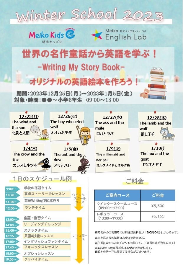 2023年の冬は「世界の名作童話から英語を学ぶ!オリジナルの英語絵本を作ろう!」がテーマとなります。世界の名作童話を日替わりで題材にして、英語を学びます。童話を通して、様々な英単語や表現を楽しく学びながら、お子さまご自身で書いた英文を用いて、仕掛け絵本作りにもチャレンジします。レッスンは全て英語で行いますが、バイリンガルのスタッフがサポートに入りますので、英語学習が初めてのお子さまでも、安心してご参加いただける内容となっております。