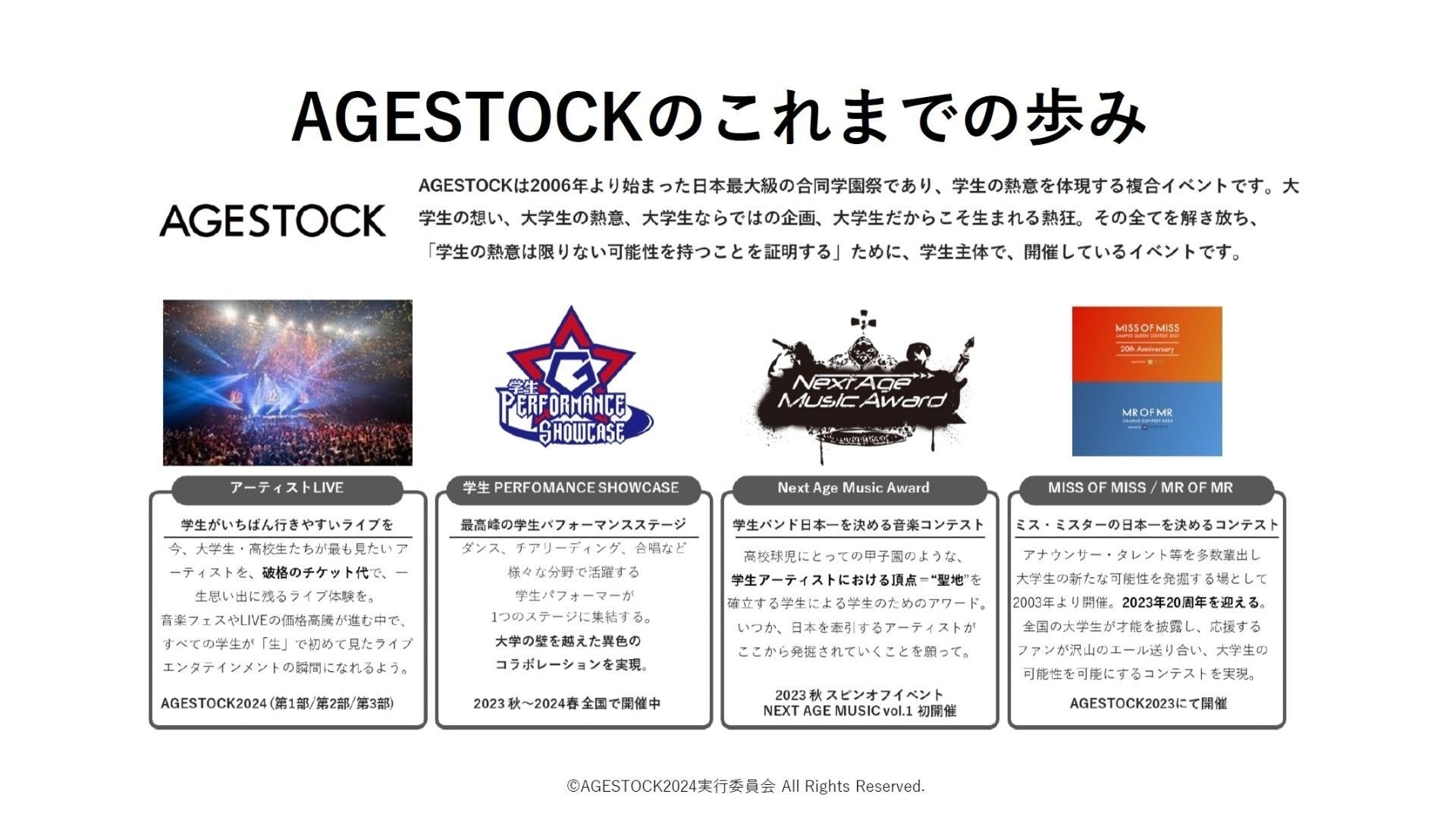 学生団体AGESTOCK実行委員会は、首都圏65大学から集まり約600名が所属する日本最大級の学生団体。主な活動は「イベント制作」「広報活動」「渉外活動」の3軸です。