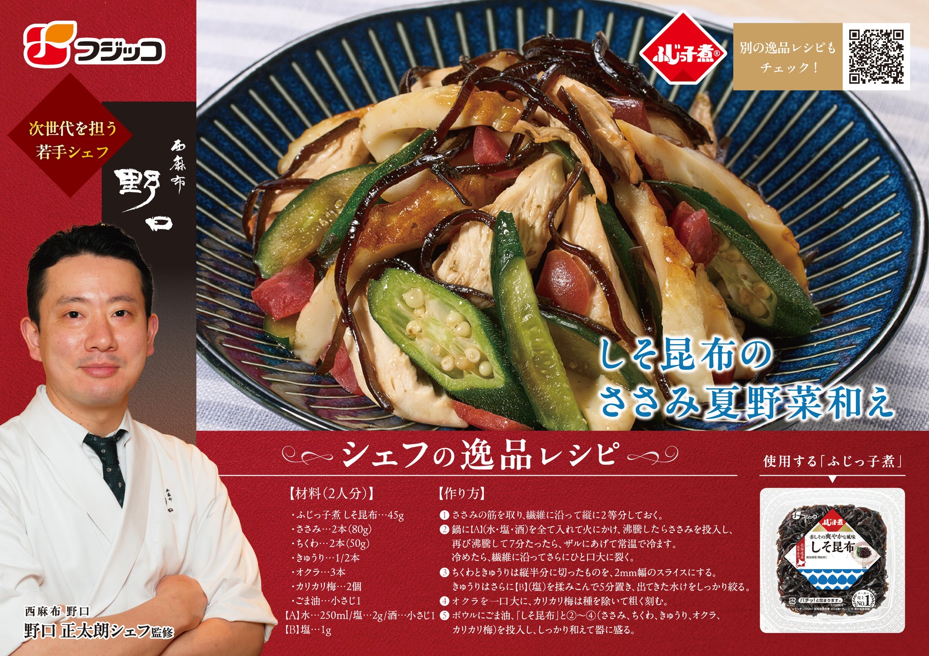 「ふじっ子煮」シリーズは1971年の発売から、ごはんのお供としてお客様に長くご愛顧いただいている商品です。今回はごはんのお供としてだけでなく、調味料用途としてお使いいただけるよう、これからの日本料理界を担う若手シェフたちが、旬の食材を活用した夏にぴったりなレシピを提案いたします。