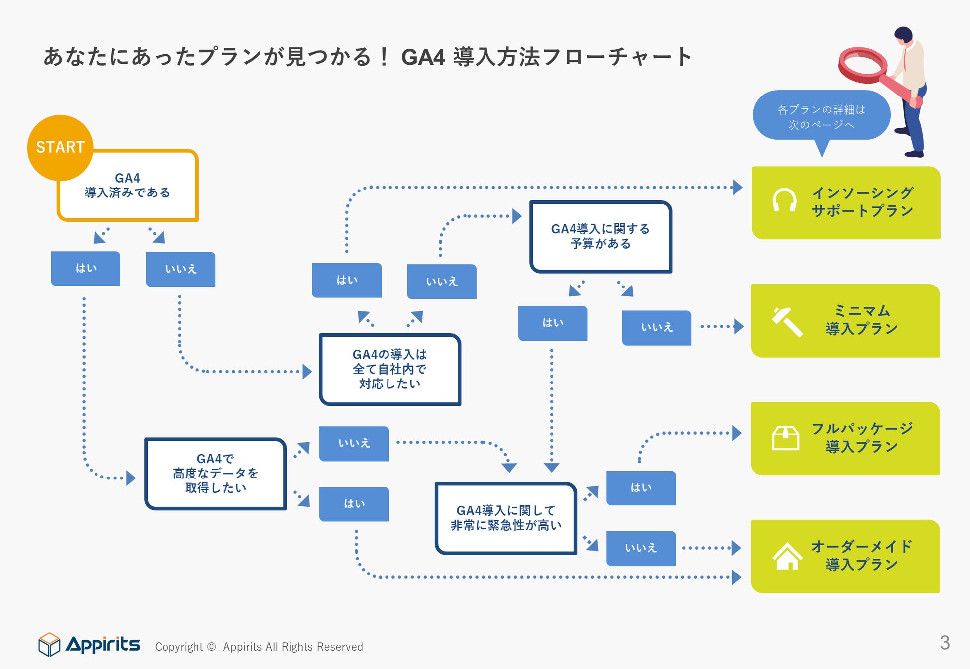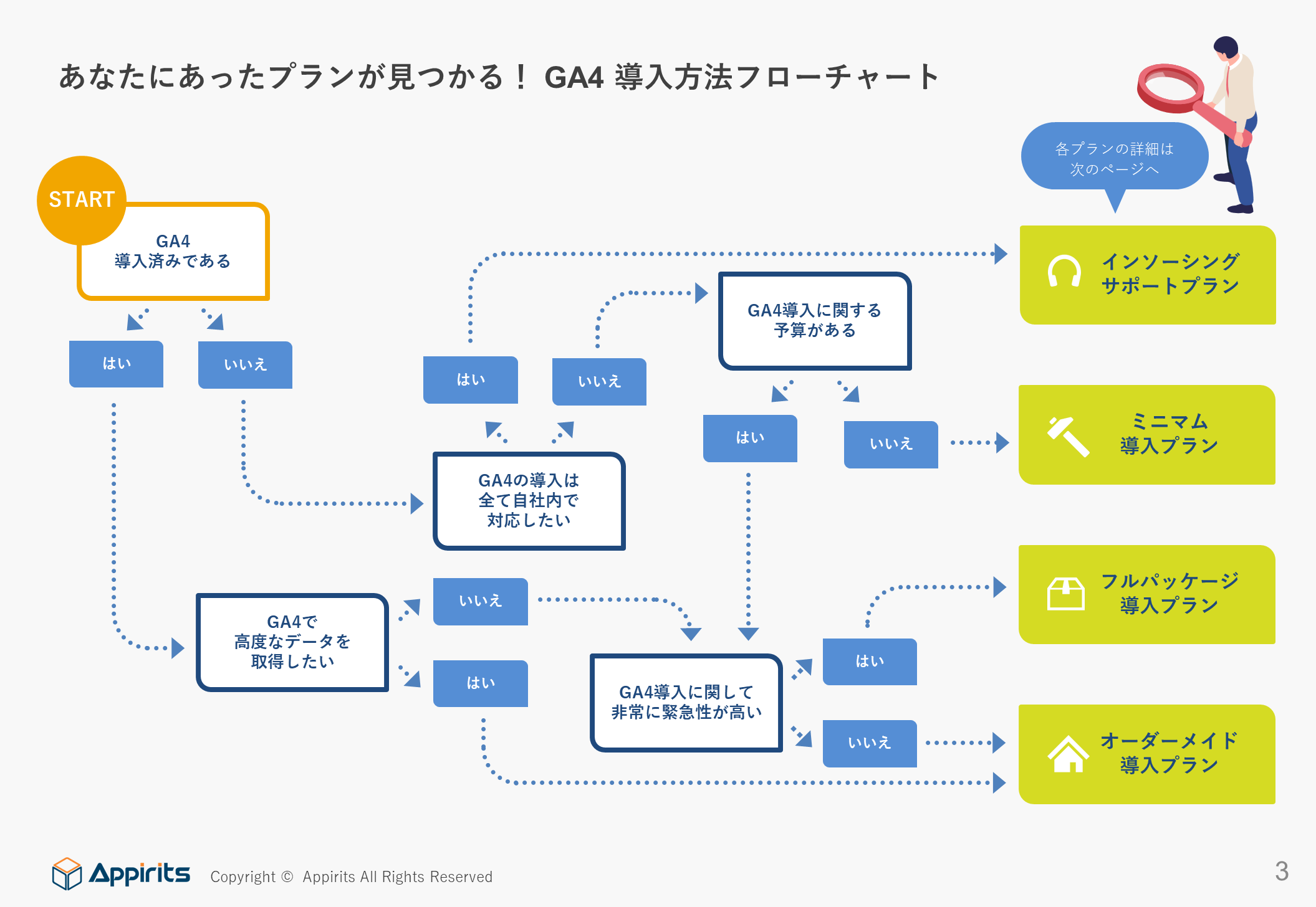 GA4は、従来のUAとは全く異なる新しいGoogle Analyticsです。これまで300社以上に対してデジタルマーケティング支援を行ってきたアピリッツは、お客様のビジネス要件に合わせた移行プランを複数用意し、GAと同様のデータ取得をGA4でも安全に実現するための導入ノウハウと、設定代行支援を提供します。