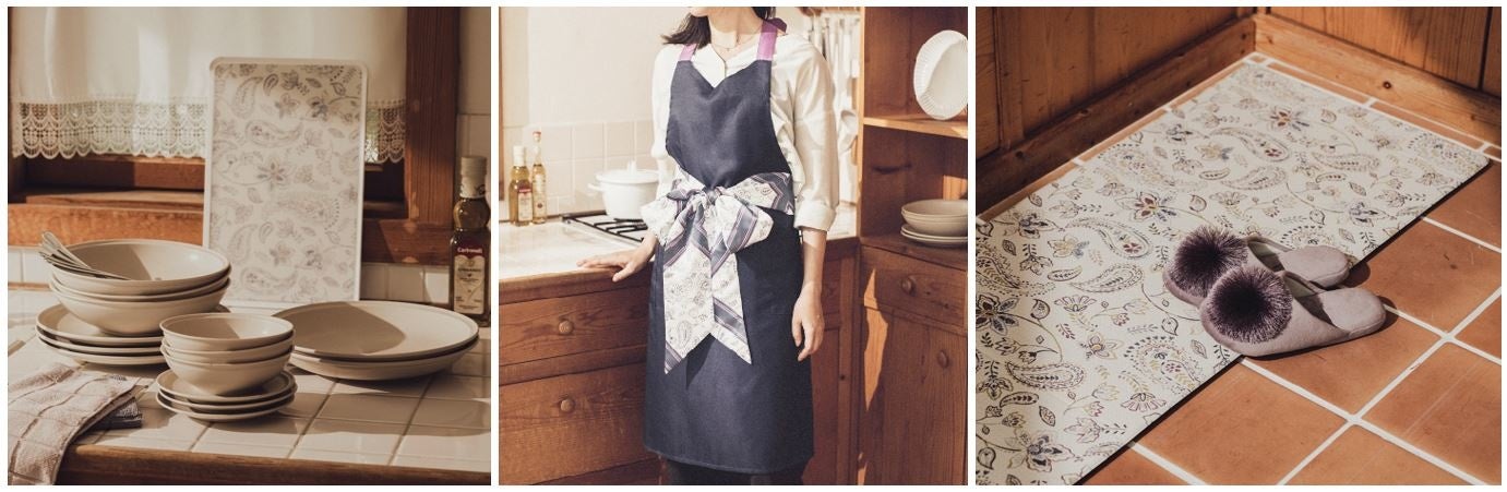 デコホームの秋の新シリーズは大人かわいいペイズリー柄。リビング、寝室、キッチン、バスルームなど、シリーズ商品でプチコーディネートを楽しめます。