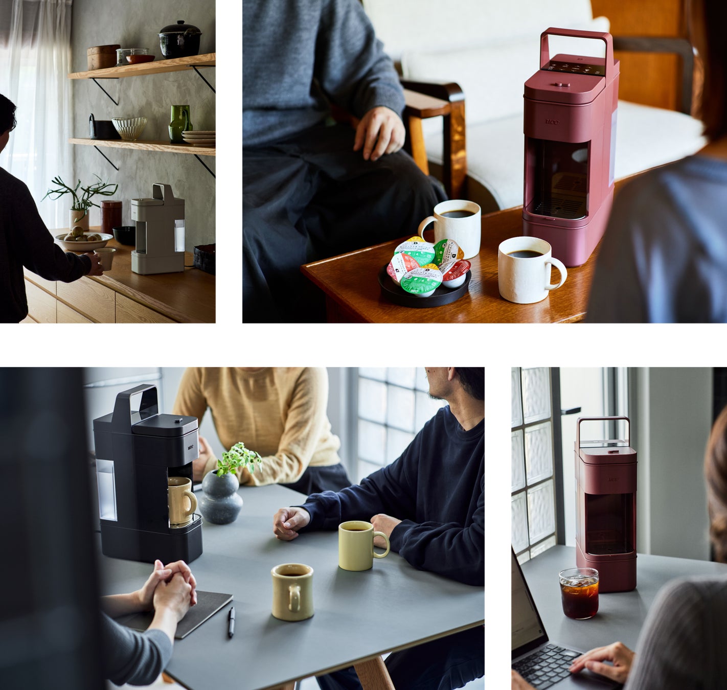 いつでも、どこでも、「最高の一杯」がボタンひとつで味わえる、プロのハンドドリップを再現した「ドリップポッド」のコーヒーシステムを、キッチンやダイニングだけでなくリビングや寝室、屋外など、今までドリップマシンが登場しなかった場所で利用できるよう、マシン上部のキャリーハンドルが特徴的なデザインです。マシンのパイピングや曲線など細部までデザインにこだわり、置いておくだけでいい、毎日見ても飽きない、そんな長く一緒にいられる暮らしのパートナーのような、普遍的な佇まいのコーヒーマシンを目指しました。
