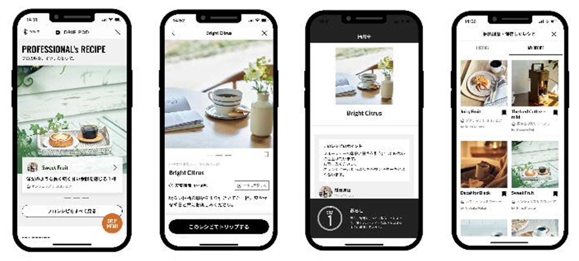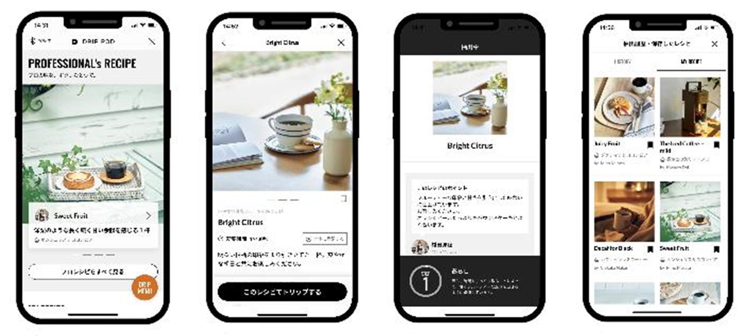 (左から:トップ画面より抽出したいレシピを選ぶことが可能/プロレシピ詳細では味わいの特徴について解説/抽出中はまるで隣でプロが解説しているかのように各工程でのコツが表示される/お気に入りのレシピはマイレシピに保存し、次回からさらに簡単に抽出が可能)