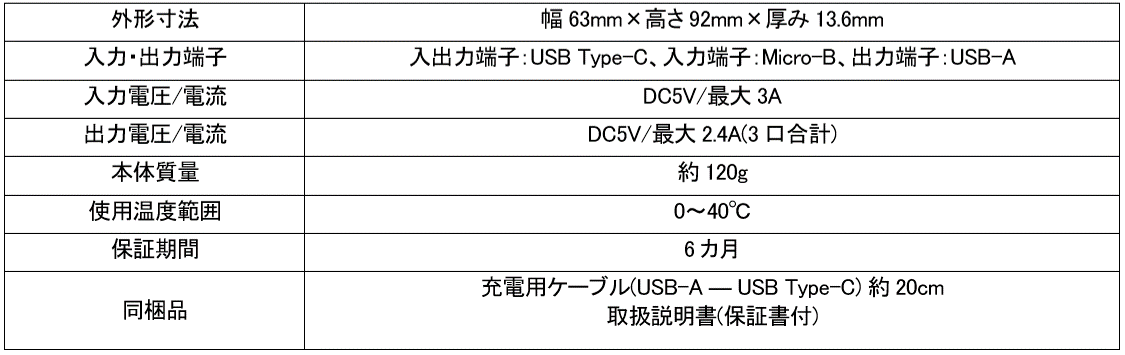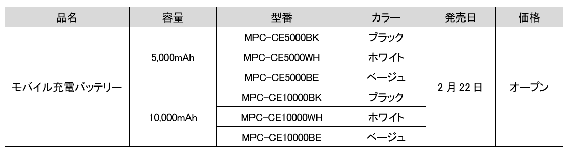 モバイル充電バッテリーの販売数量は外出機会の増加により前年比約115%(*2)と引き続き伸長しています。また、地震などの災害による停電への備えとして、モバイル充電バッテリーは防災グッズに推奨されています。本製品はコンパクトなサイズに加えて、接続した機器3台を同時に充電(*1)できます。モバイル充電バッテリー本体を充電しながら、接続したスマートフォンなどの機器を同時に充電できるパススルー機能を搭載しているので、旅先だけでなく普段使いとしても快適に使用できます。ビジネスシーン、カジュアルシーンどちらにもなじむベージュを新たに加え、ブラック、ホワイトの計3色をラインアップしました。