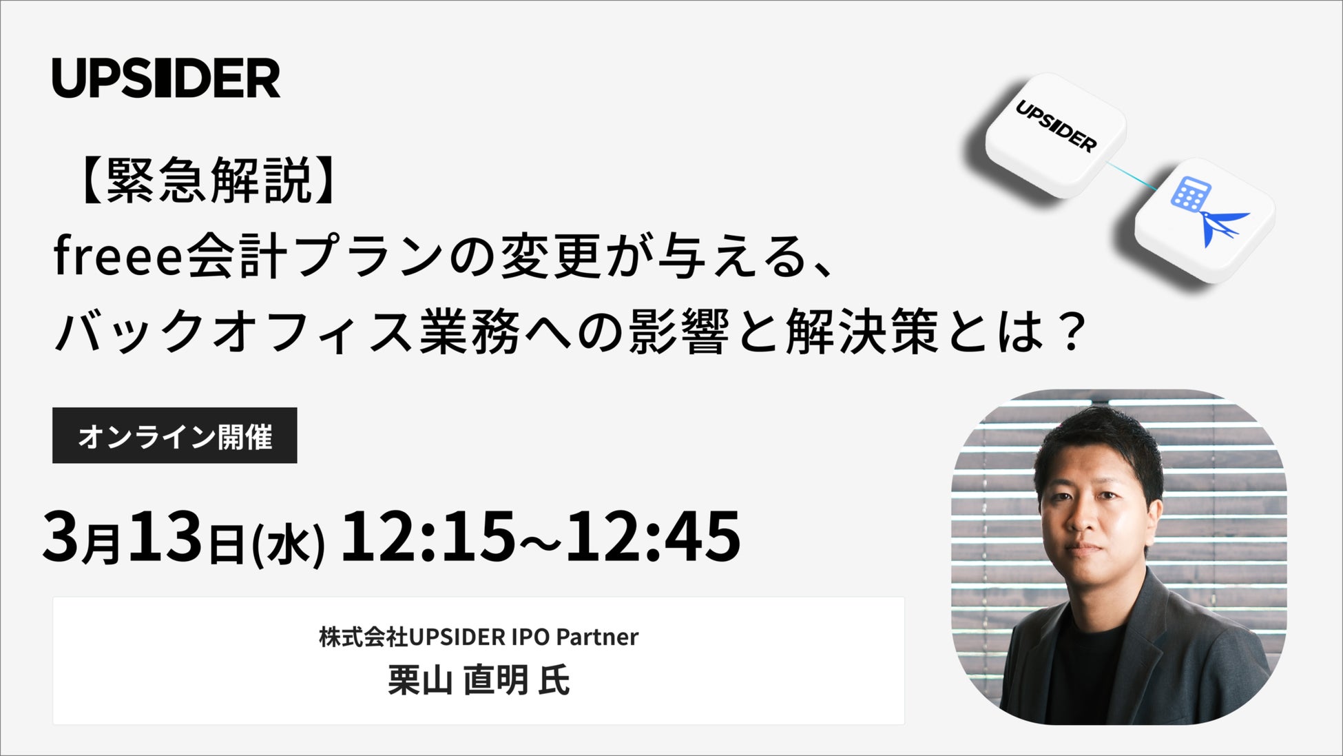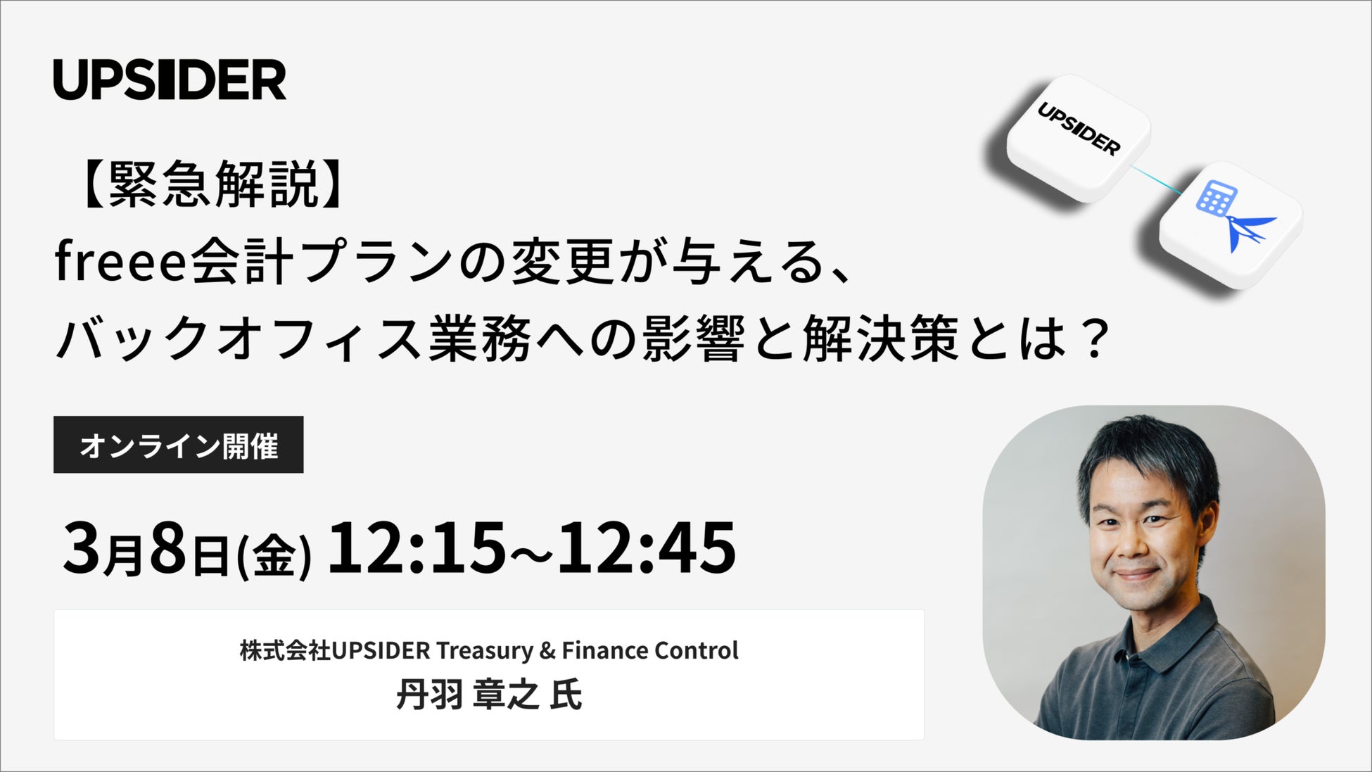 35,000社以上が利用する*サービスを提供する株式会社UPSIDER(代表取締役:宮城徹・水野智規、本社:東京都港区、以下 当社)は、「freee会計」を提供するフリー株式会社が2月26日に発表したプラン改定を受け、経理部門がサービス選定の際に求められる対応や検討のポイントなど、意思決定に必要な情報を網羅的にお話しするオンラインセミナー(以下 本イベント)を3月8日(金)・13日(水) ランチタイムに開催いたします。本イベントは、UPSIDERユーザーかどうかにかかわらず、どなたでも無料でご参加いただけます。