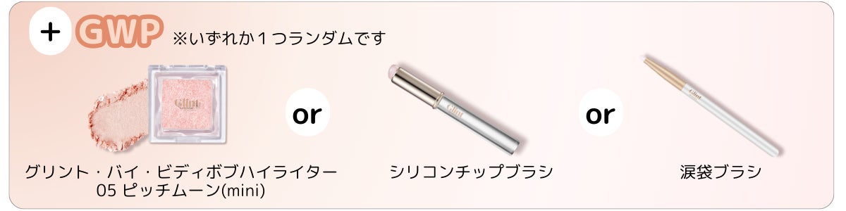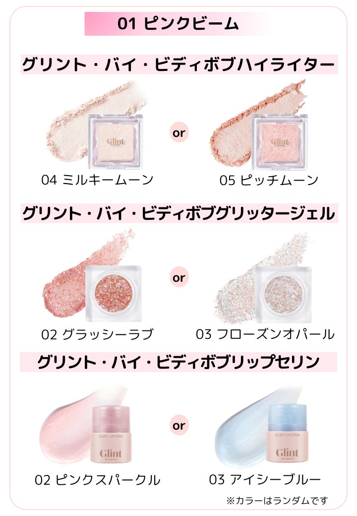 ピンク系のカラーを詰め込んだ「ピンクビーム」とベージュ系カラーを詰め込んだ「ベージュビーム」2タイプのラッキーボックスを発売いたします。それぞれのラッキーボックスにはハイライター・グリッタージェル・リップセリンが入っており、さらに購入特典としてミニサイズのハイライター・シリコンチップブラシ・涙袋ブラシのいずれか一つが入っています。この世のすべての輝きからインスピレーションを受けて誕生したブランド「Glint」らしい、多彩なきらめきを放つアイテムを使って、イルミネーションにも負けない“キラキラ”メイクを完成させてください!