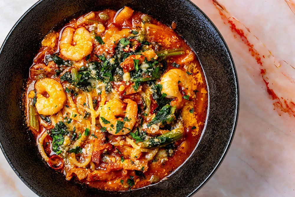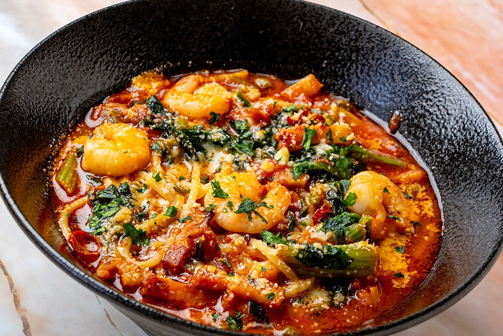 【メニュー名】 ベーコンと海老、ほうれん草のピリ辛トマトスープ