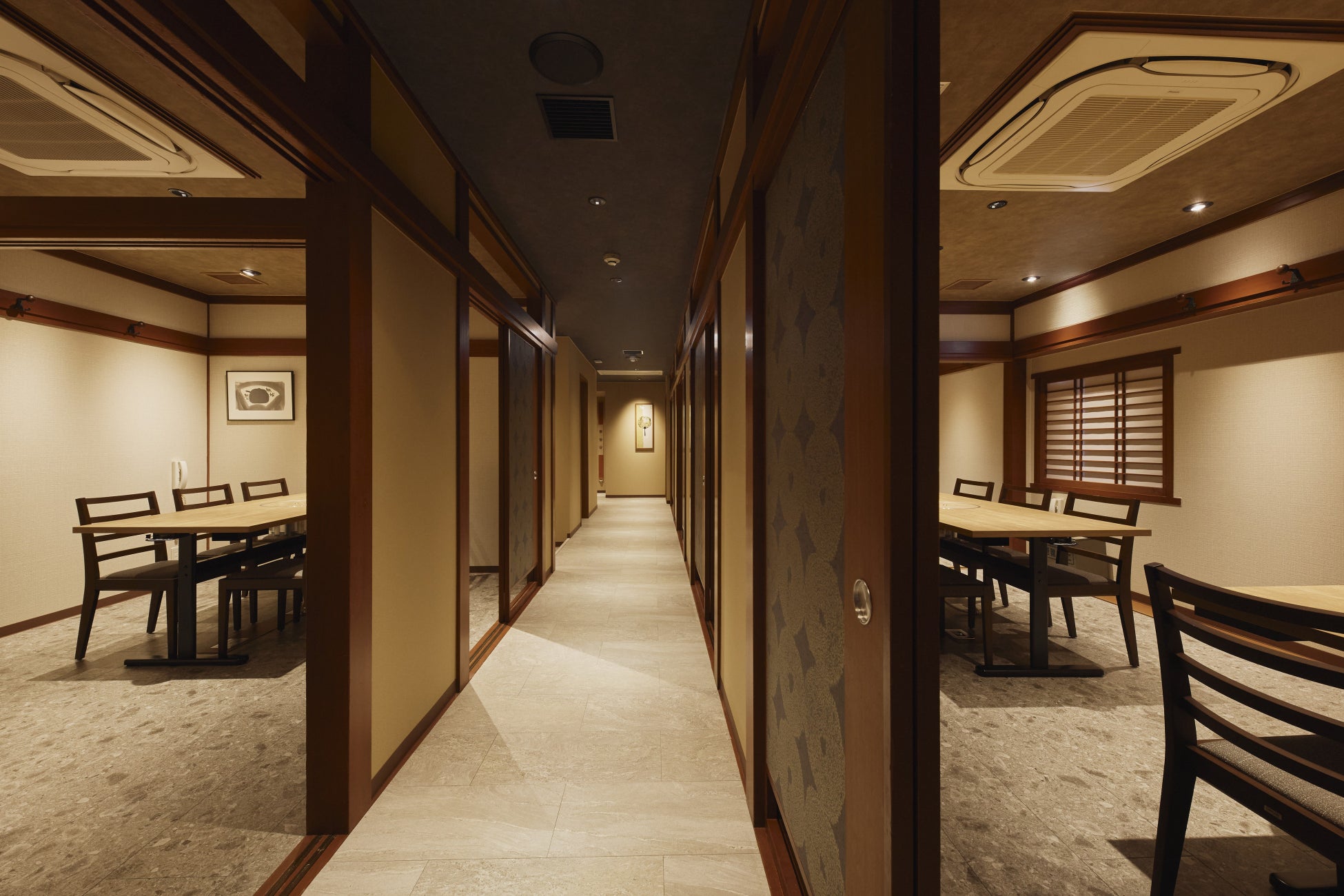 和を基調とした落ち着いた雰囲気で開放感のある大広間と、少人数から大人数まで幅広いお食事の機会に対応できる個室がございます。