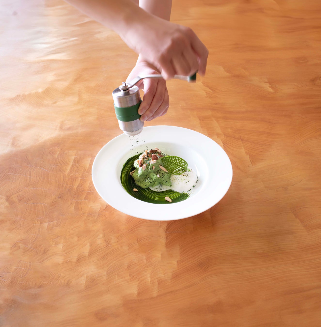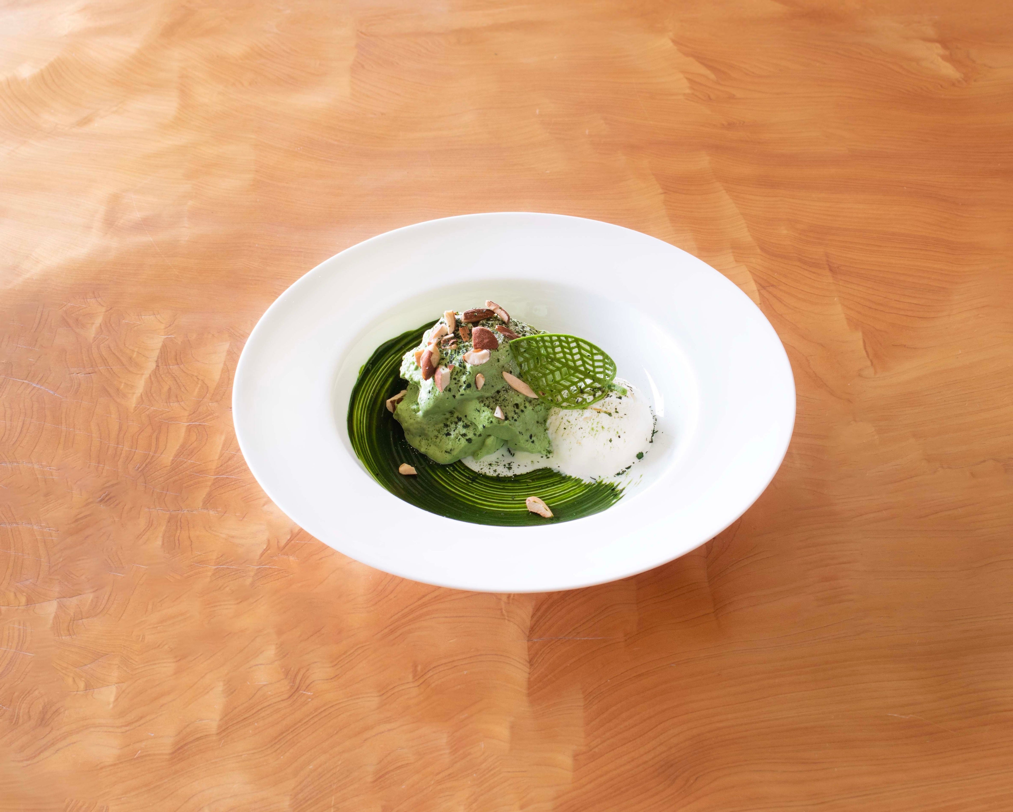 抹茶をしみこませたスポンジ生地の上に、毎朝厨房で仕込む抹茶マスカルポーネクリームを乗せ、新茶をかけてお召し上がりいただくふわとろ食感の抹茶ティラミスです。商品をお席まで運んだ後、お客様の目の前でスタッフが新茶をミルで挽き、仕上げます。