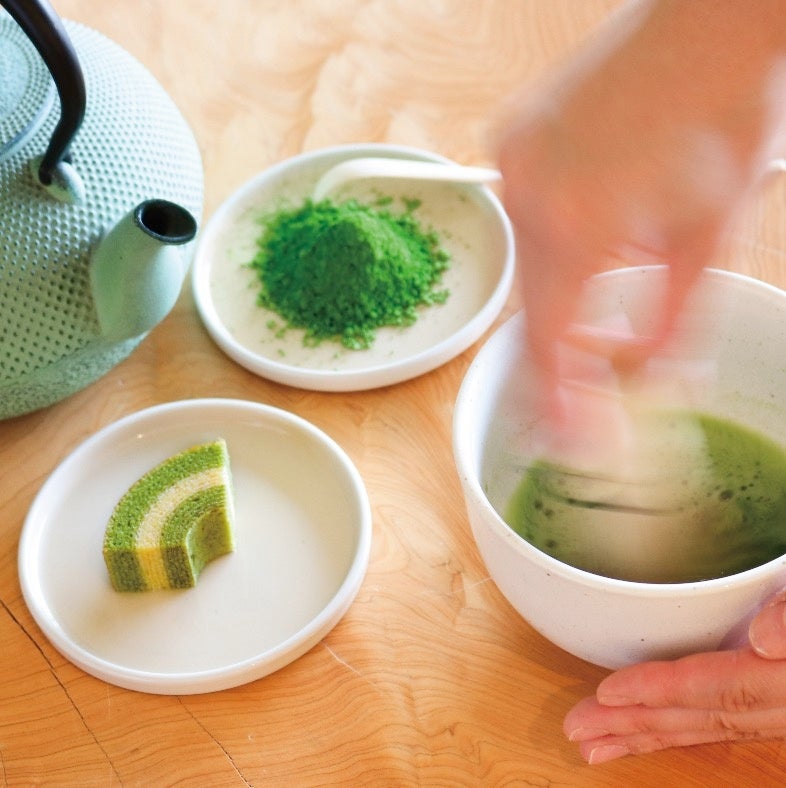 「京ばあむ」の美味しさを支える抹茶の秘密を、体験を通してご紹介します。京ばあむに使用している抹茶でお抹茶点て体験をした後、ひとくちサイズの京ばあむと一緒にお召し上がりいただきます。