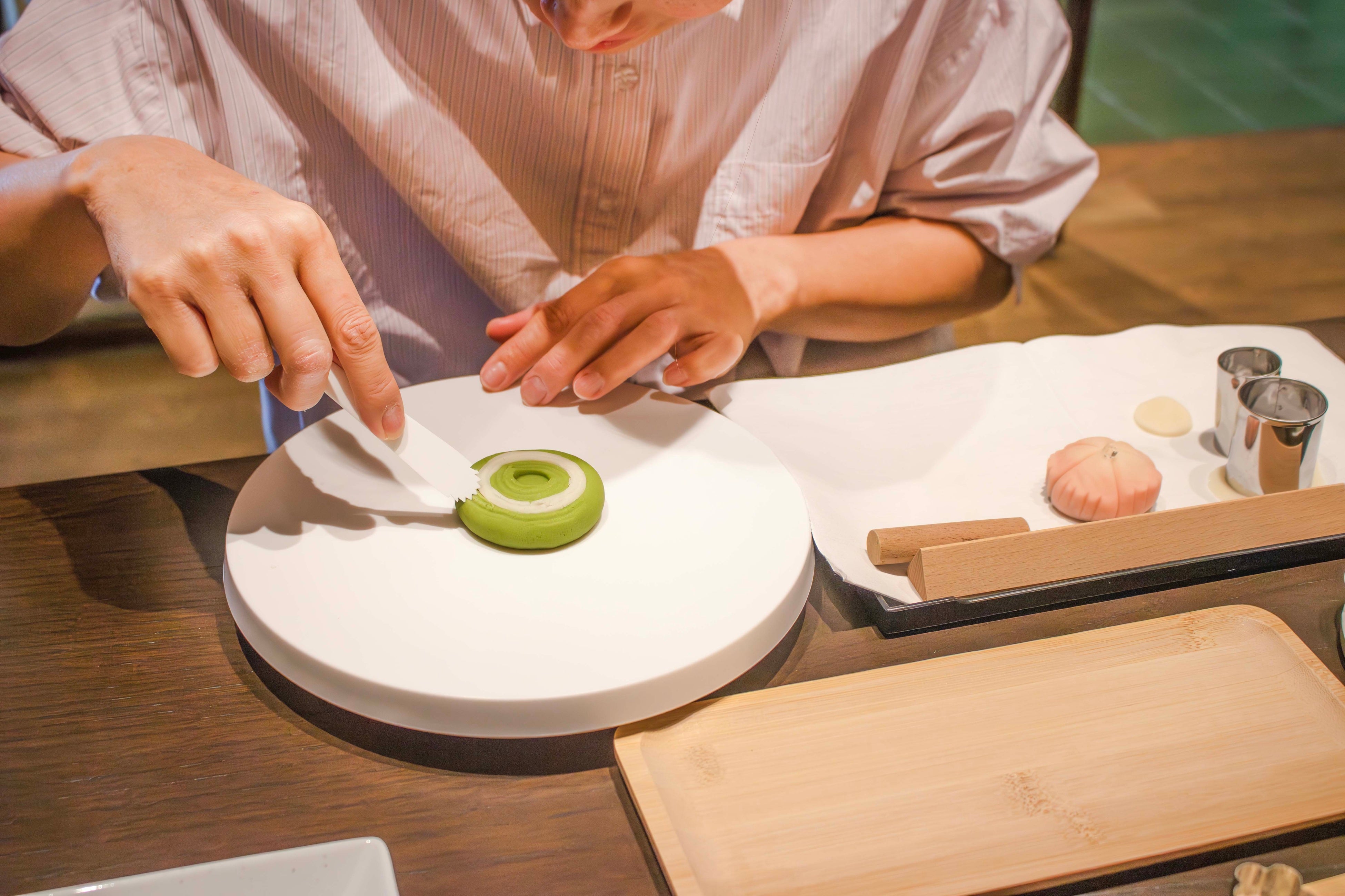 和菓子職人の経験を持つばあむ職人とともに、2種の上生菓子(京あんばあむ他1種)を作ります。完成後、ご自身で点てたお抹茶と共にお召し上がりいただけます。昨年は職人への質問や専門的な話に会話が弾み、非常に高い満足度をいただいた人気プログラムです。