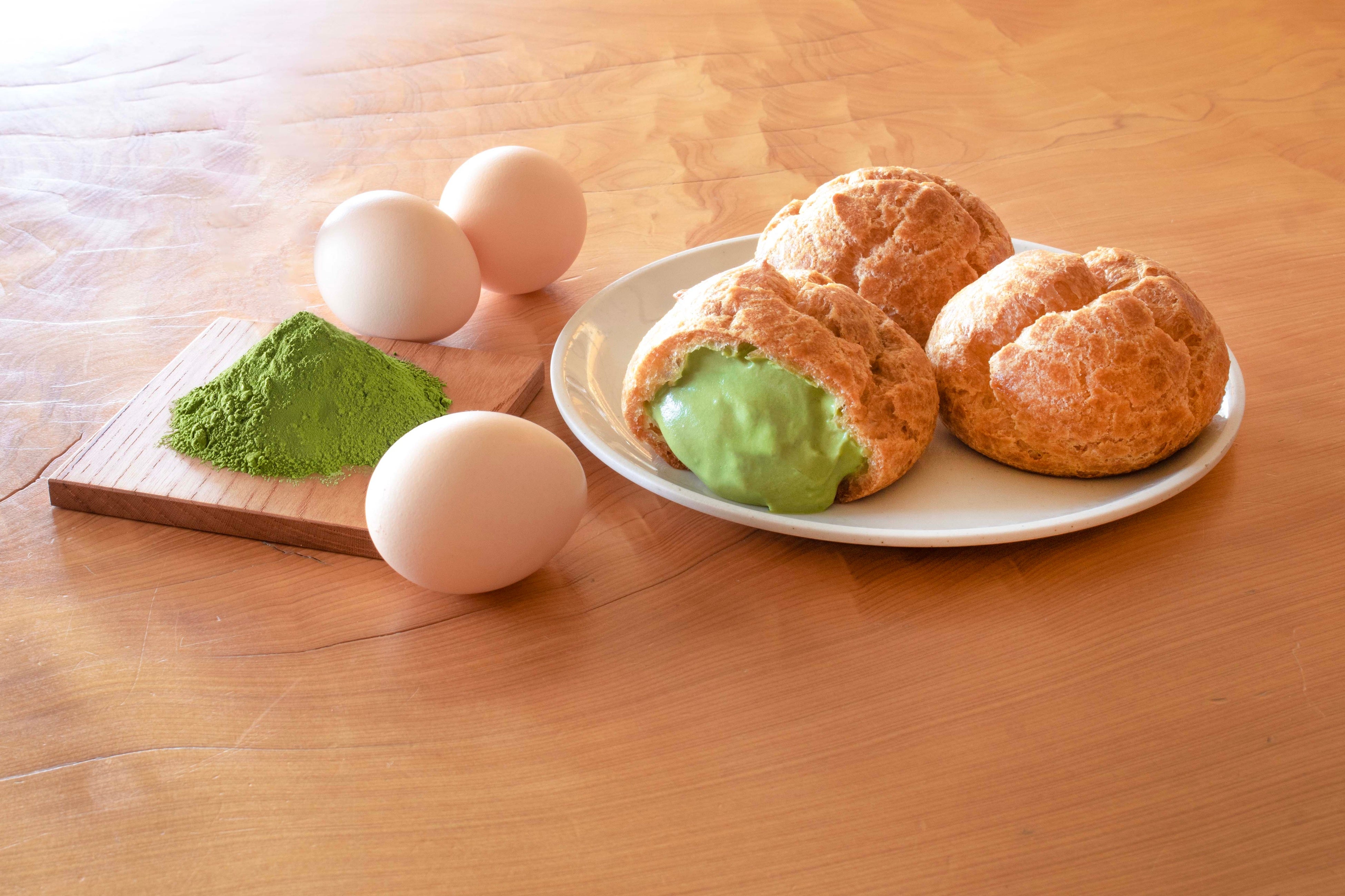 人気の「たっぷりたまごカスタードシュー」に、期間限定の「抹茶味」が登場します。さくらたまごを使用した濃厚なカスタードクリームに、京ばあむに使用している天保七年創業「森半」の宇治抹茶を合わせたシュークリームです。薄く焼き上げたシュー生地に、ご注文を受けてからクリームを絞ります。