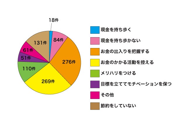 節約で心掛けている事について多かった回答は「お金の出入りを把握する」「お金のかかる活動を控える」でした。