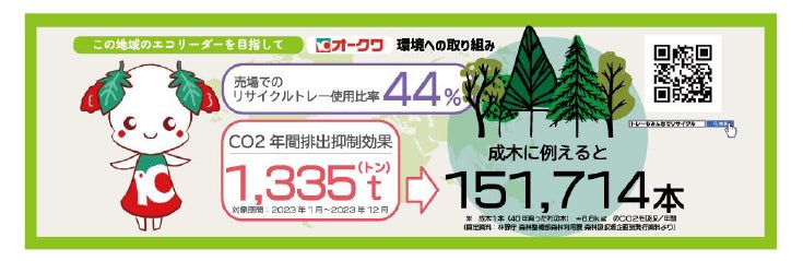 2024年度はオークワの店舗・店頭での環境取り組みの訴求や環境イベントの実施でお客様の理解を深め、回収トレーを増やす事で、年内での『使用済み食品トレー回収量150t』の資源回収を目指し、「エコトレー」「エコAPET」を積極的に使用する事でCO2排出抑制『年間1,500t』を目指します。