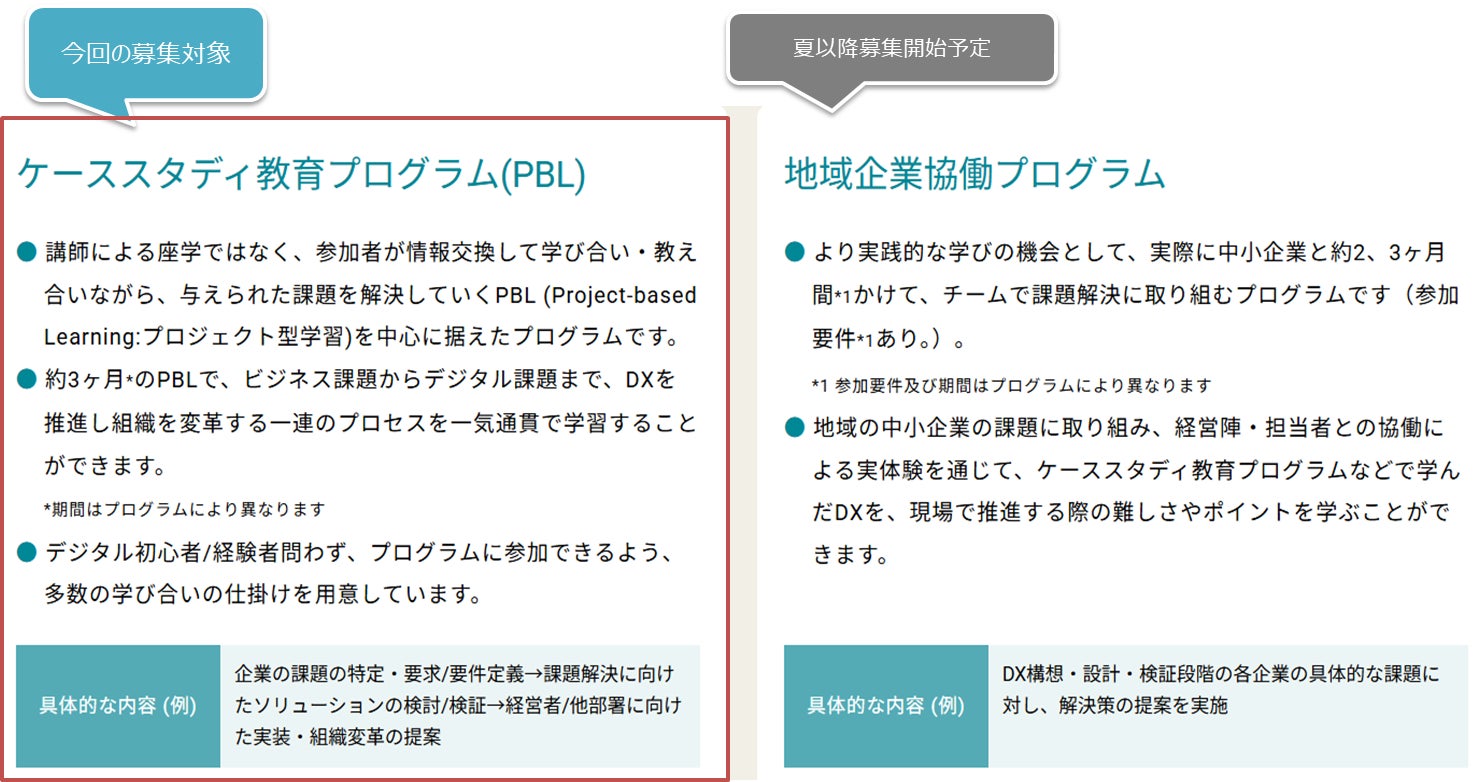 マナビDX Questは、(1)企業データに基づく実践的なケーススタディ教育プログラム(以下、「ケーススタディ教育プログラム」という。)及び(2)地域の中小企業との協働による、デジタル技術を活用した協働プログラム(以下、「地域企業協働プログラム」という。)からなります。