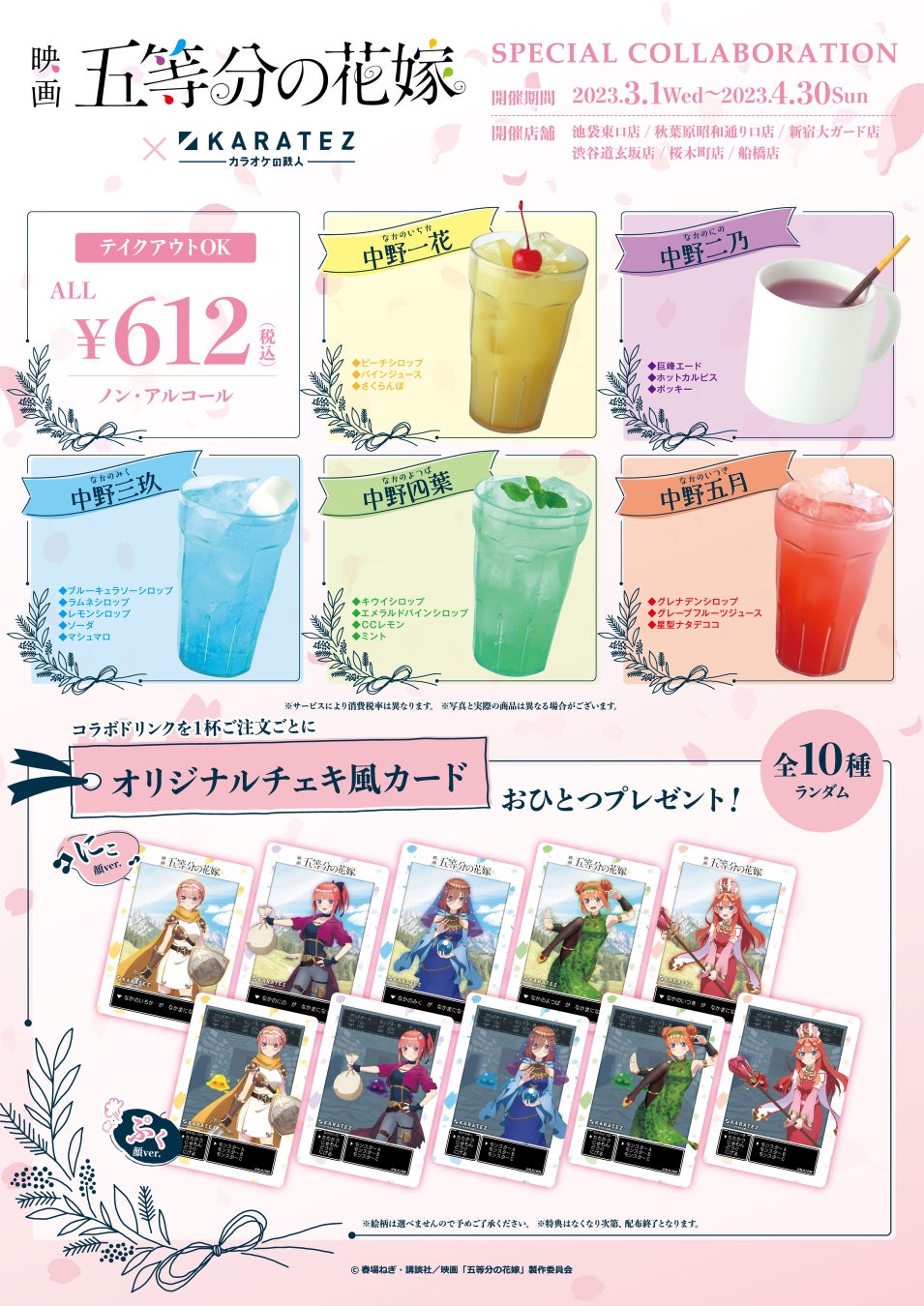 コラボ開催全店舗では、映画「五等分の花嫁」に登場するキャラクターをイメージしたコラボドリンクを販売するほか、池袋東口店、秋葉原昭和通り口店、新宿大ガード店では、複数のノベルティが付いたセットメニュー、コラボグッズを販売します。