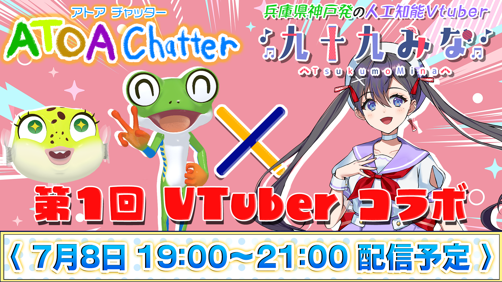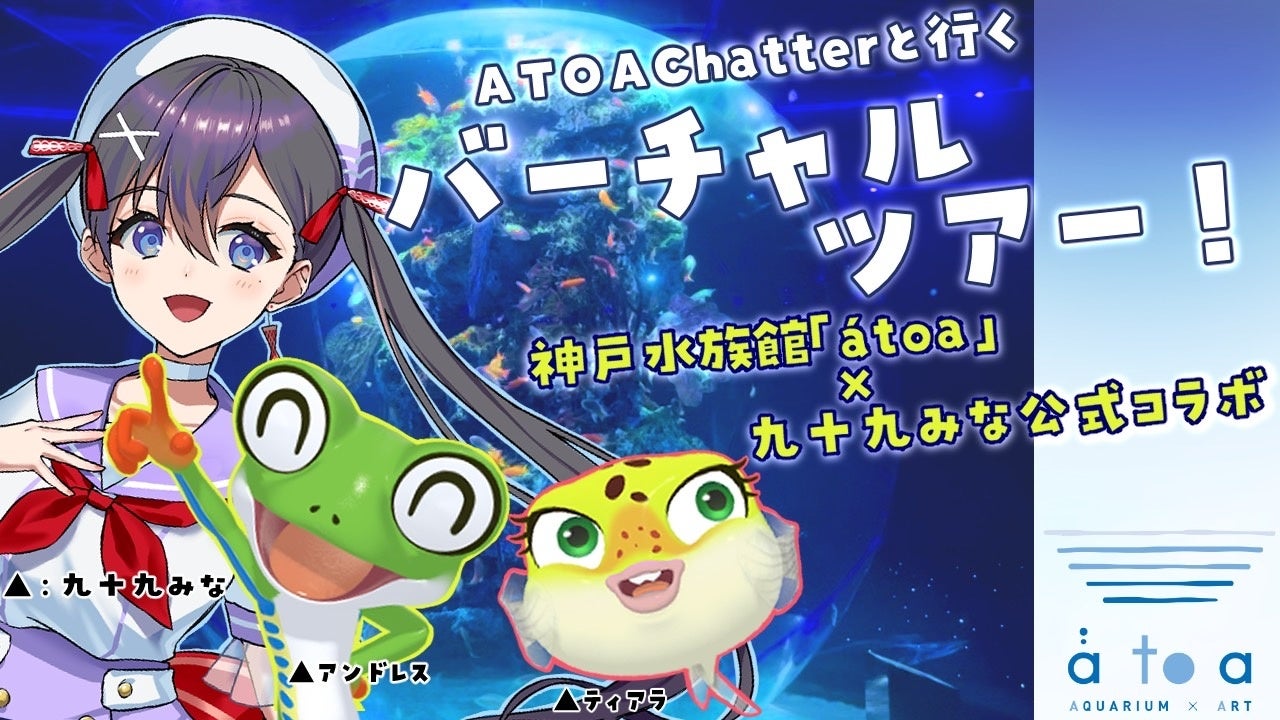 AQUARIUM×ART átoa(神戸市中央区、以下アトア)では、人とお話ができる4匹の生きもの「ATOA Chatter(アトアチャッター)」と兵庫県や神戸のアピール動画や、歌ってみた動画など・・・YouTubeやTwitterを中心に活動中VTuberの九十九みな氏とコラボし、YouTubeライブ配信を実施します。