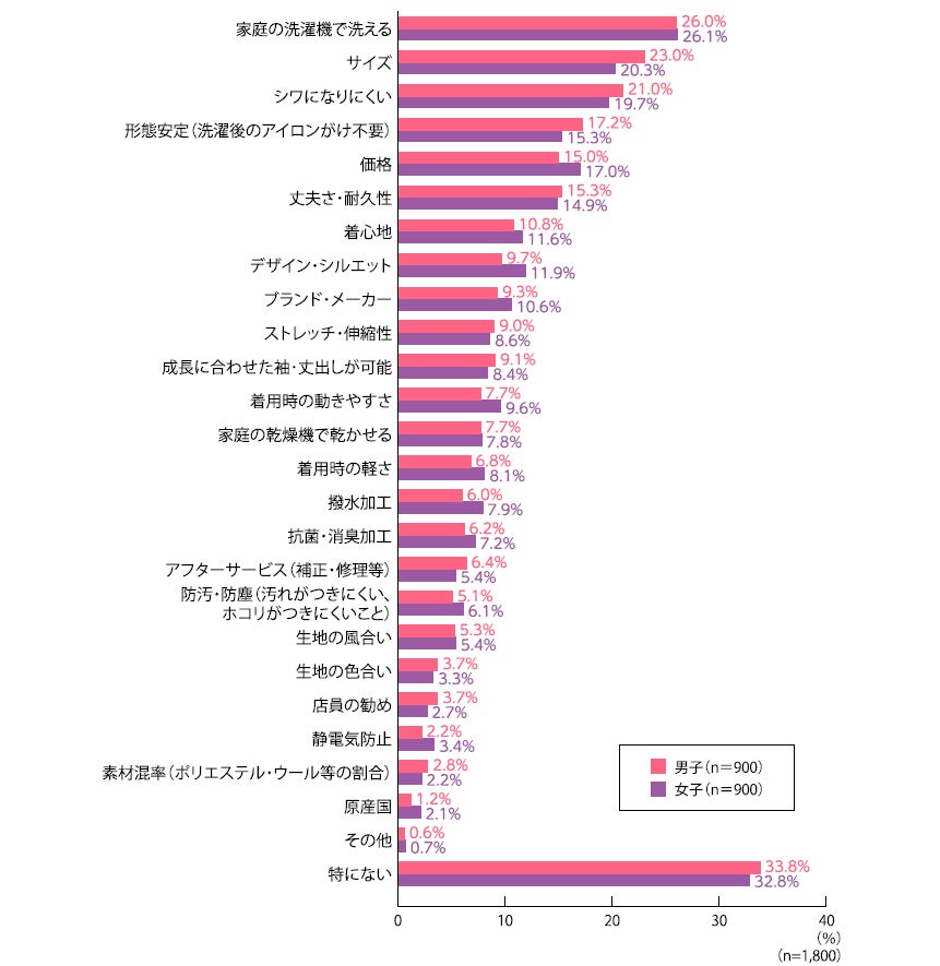 また、保護者が入学前に戻って制服の買い直しができるとしたときに、制服購入で重視したいことは、洗濯・お手入れに関する「家庭の洗濯機で洗える」(男子26.0%、女子26.1%)、「シワになりにくい」(男子21.0%、女子19.7%)、「形態安定(洗濯後のアイロンがけ不要)」(男子17.2%、女子15.3%)が多く、洗濯・お手入れ以外では「サイズ」(男子23.0%、女子20.3%)が2番目に多いという結果になりました。そのほかにも着心地・デザイン・機能・丈夫さ・耐久性などがあげられていましたが、洗濯・お手入れとサイズ選びは新入学時の制服購入時の重要ポイントになるようです。