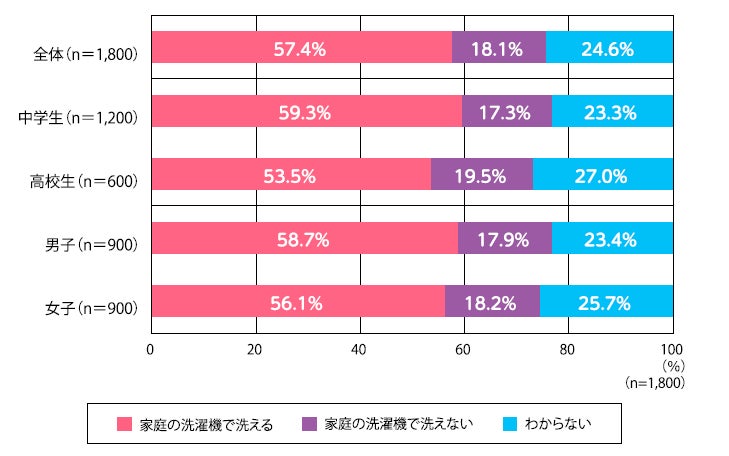 また、購入した制服が家庭の洗濯機で洗えるかどうか「わからない」(全体24.6%、中学生23.3%、高校生27.0%、男子23.4%、女子25.7%)という回答もみられ、新中学・高校生の保護者の4人に1人が購入した制服(上着)の家庭洗濯可否を知らないという状況でした。
