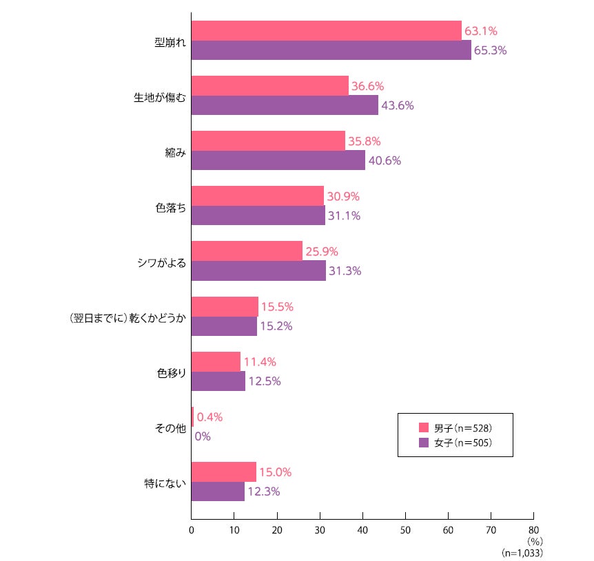 家庭洗濯が可能な制服を購入した保護者が、家庭の洗濯機で制服を洗うことへの不安は、「型崩れ」(男子63.1%、女子65.3%)が最も多く、続いて「生地が傷む」(男子36.6%、女子43.6%)、「縮み」(男子35.8%、女子40.6%)、「色落ち」(男子30.9%、女子31.1%)、「シワがよる」(男子25.9%、女子31.3%)、「(翌日までに)乾くかどうか」(男子15.5%、女子15.2%)などの不安がみられました。