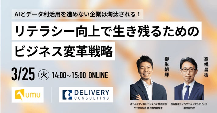 ユームテクノロジージャパン株式会社(本社:東京都新宿区、代表取締役:松田しゅう平、https://www.umujapan.co.jp、以下 ユームテクノロジージャパン)は、株式会社デリバリーコンサルティング(本社:東京都港区、取締役CEO:内藤 秀治郎)と共同で、「AIとデータ利活用を進めない企業は淘汰される!リテラシー向上で生き残るためのビジネス変革戦略」と題するオンラインセミナーを、2025年3月25日(火)14:00〜より開催いたします。