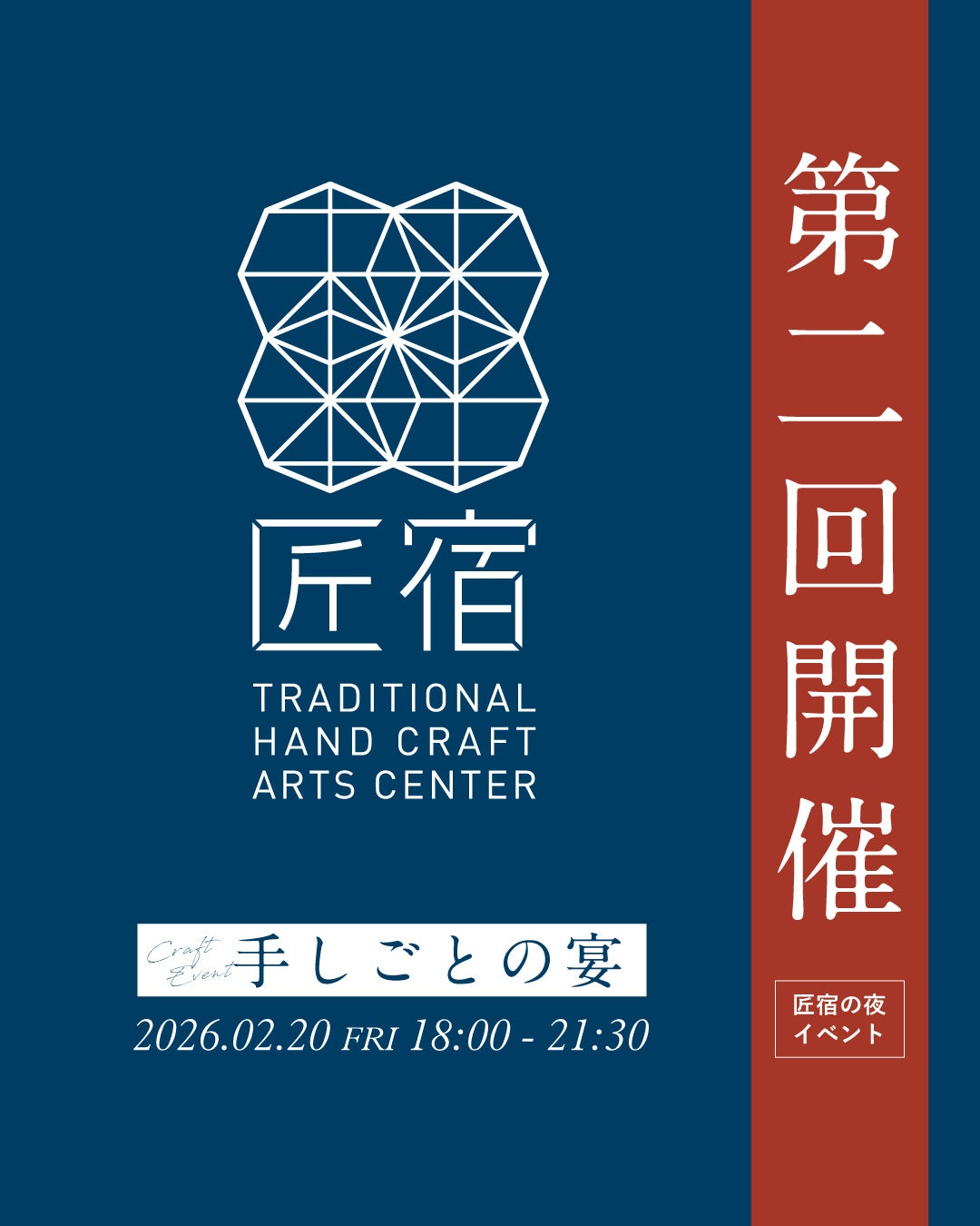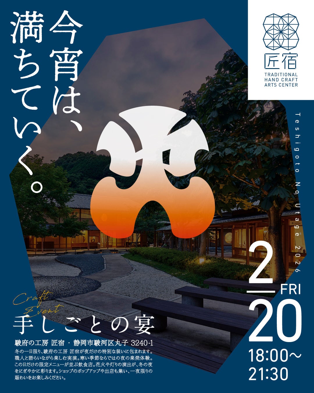 静岡市の日本最大級の伝統工芸体験施設『駿府の工房 匠宿』(株式会社創造舎、代表取締役:山梨洋靖)にて、2026年2月20日(金)夜イベント「手しごとの宴」を開催いたします。