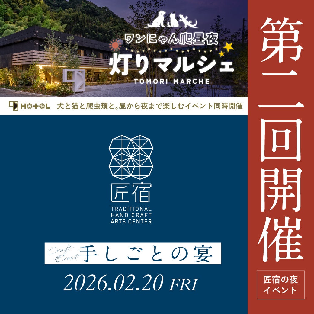 また、匠宿に隣接する1HOTELにて「ワンにゃん爬昼夜~灯りマルシェ~」も同時開催決定。家族の一員である動物と一緒に過ごせる、一夜限りのあたたかなマルシェです。こちらも併せてお楽しみください。