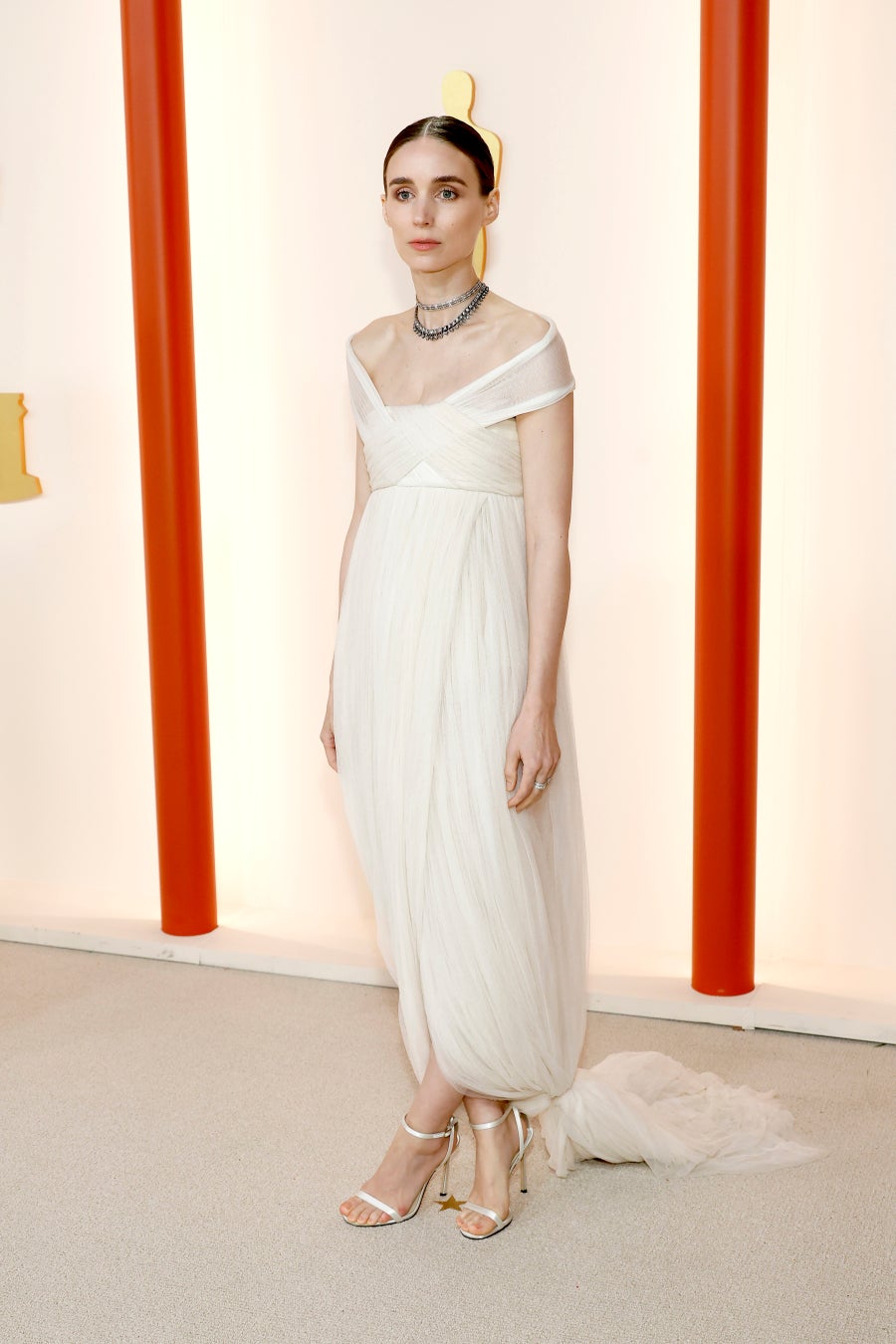 ルーニー・マーラは、バンドゥードレープとトレーンが特徴的なアイボリーのドレスを着用し登場。