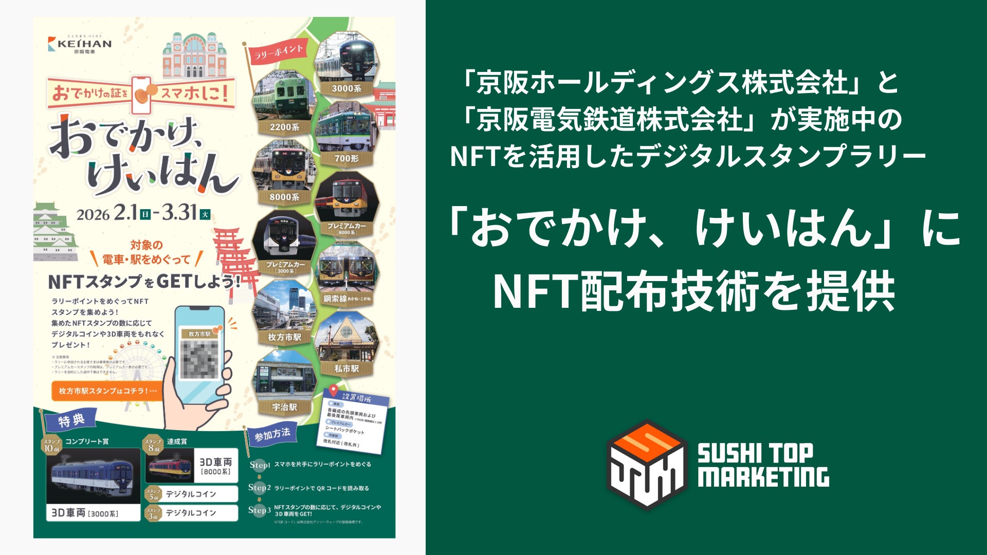 SUSHI TOP MARKETING株式会社(本社:東京都千代田区、代表取締役:徳永 大輔、以下「当社」))は、京阪ホールディングス株式会社(本社:大阪市中央区、社長:平川 良浩、以下「京阪ホールディングス」)と京阪電気鉄道株式会社(本社:大阪府枚方市、社長:井上 欣也、以下「京阪電車」)が実施するNFTを活用したデジタルスタンプラリー「おでかけ、けいはん」にNFT配布技術を提供いたしました。