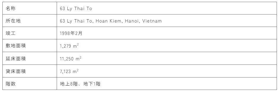 註1 Savills Market Reportのグレード定義による。現在、ホアンキエム区にあるグレードAのビルは13棟。今回の「63Ly Thai To」を加え、ダイビルはそのうちの2棟の保有・管理に関与することになる。