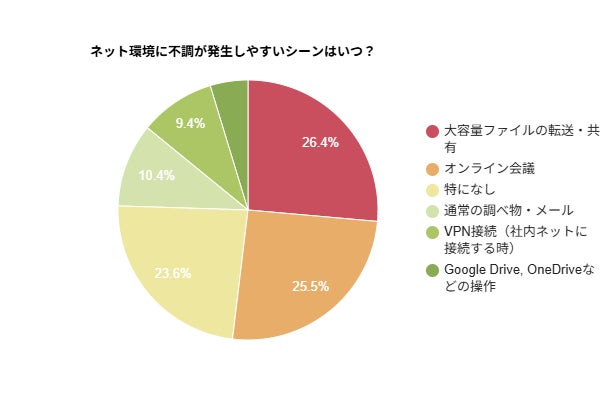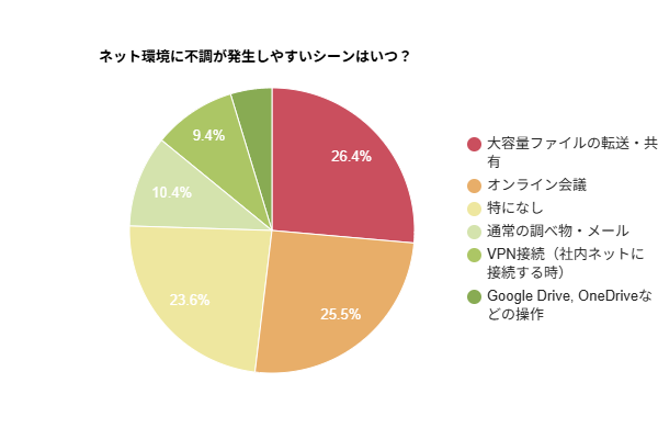 ネット環境の不調が発生しやすいシーンとして、「大容量ファイルの転送・共有」が26.4%で最も多く、「オンライン会議」が25.5%でした。これらのシーンでは特に多くのデータを一度に送受信するため、回線にかかる負荷が大きく不調が出やすいことがうかがえます。