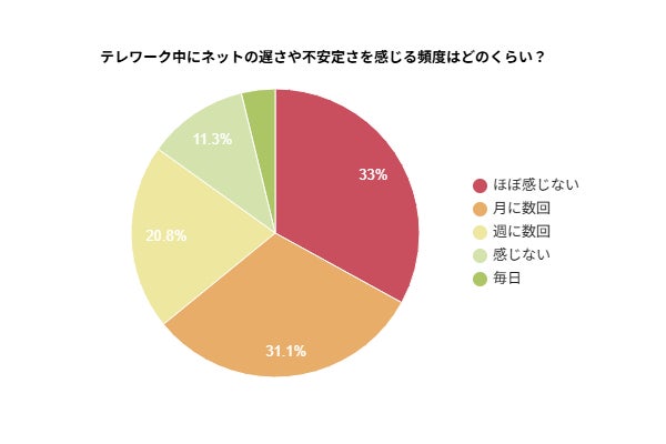 テレワーク中にネットの遅さや不安定さを感じる頻度について、最も多い回答は 「ほぼ感じない」 で33%でした。しかし、「月に数回」(31.1%)や「週に数回」(20.8%)と回答した方を合わせると、過半数が不安定さを感じていることが明らかになりました。
