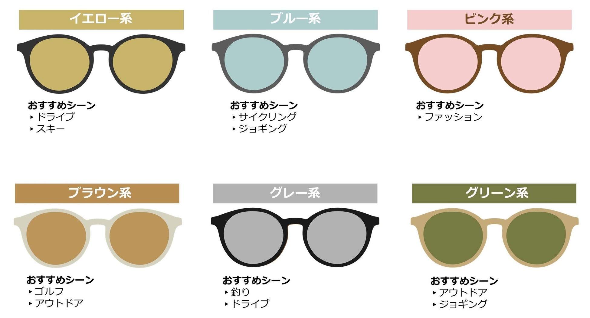 ファッションやなりたいイメージでレンズカラーを選ぶだけでなく、着用シーンに合わせて選ぶことができるのもサングラスの魅力の一つ。例えば、ブルーは黄色の光を減らすため、ヘッドライトや強い日差しなどの防眩効果が高く、グレーは眩しさを自然に抑えるうえに、無彩色で視界への影響も少ないカラー。特に日差しの強い日に最適で、ドライブや釣りにおすすめです。その他にもレンズカラーによって期待できる効果が異なるため、色ごとの特徴をおさえることで、サングラス選びがもっと楽しくなります。