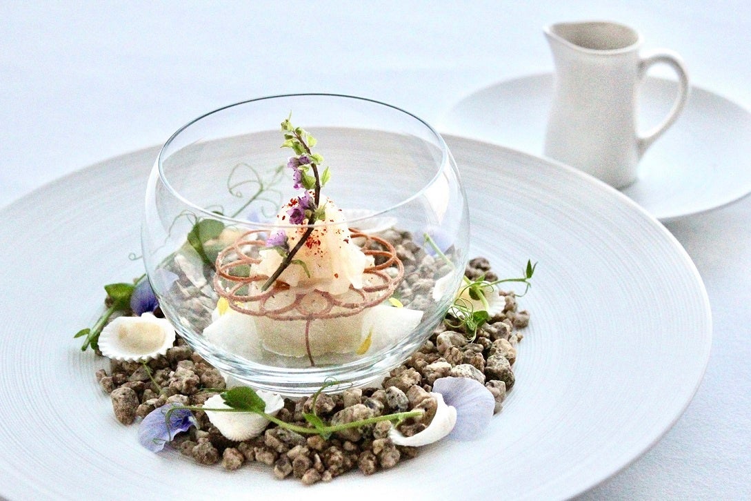 五島の醤でマリネした金沢鮮魚さんのヒラメとアオリイカ 焼きあごのチュイル