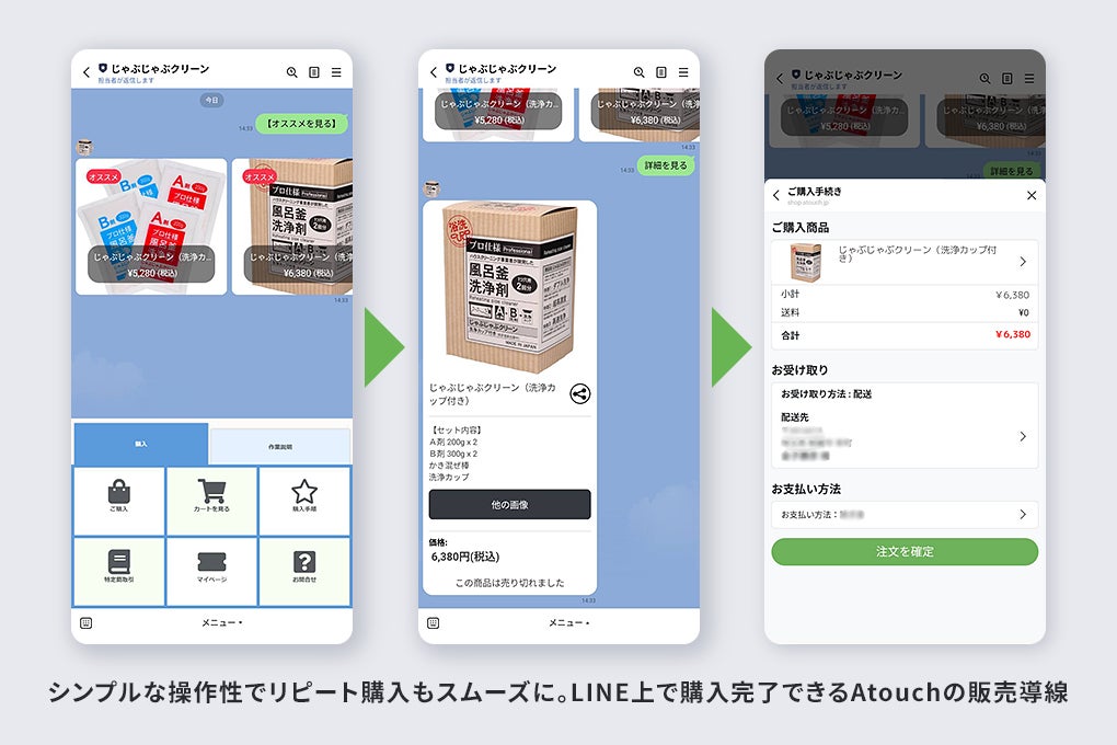 その経験を活かし、2022年10月にLINE公式アカウントAPIツール「Atouch(アタッチ)」をリリース。これにより、企業はLINEのトーク上で商品陳列や決済が可能となり、顧客はIDやパスワードなしで購入を完了できます。