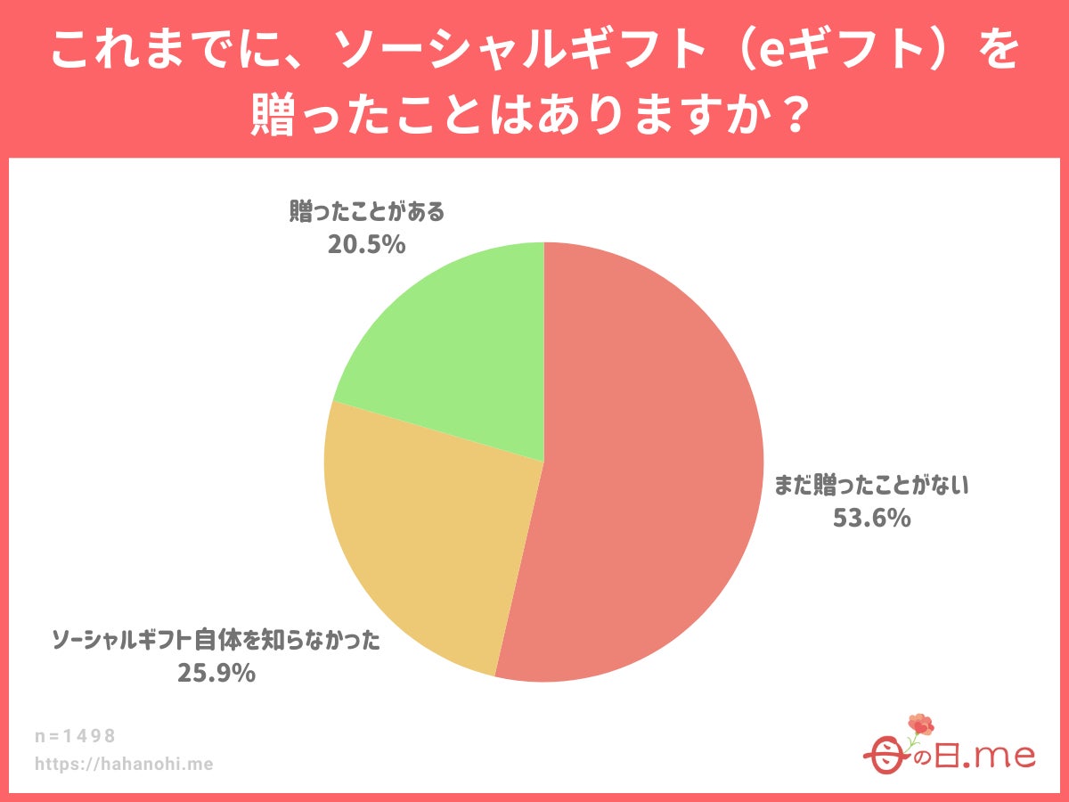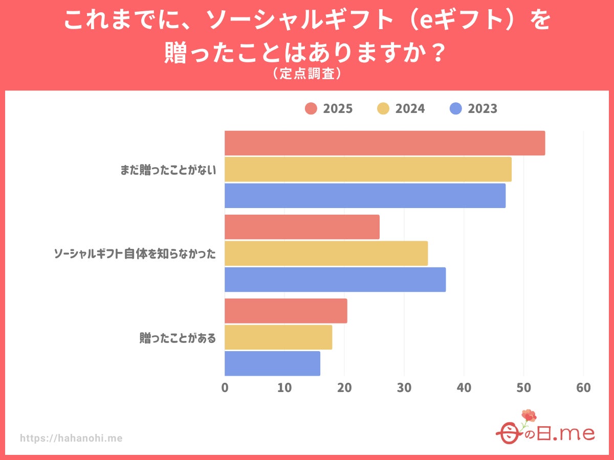 2025年の母の日ギフトにおいて、ソーシャルギフト(eギフト)の利用が着実に増加しています。母の日.meが実施した調査によると、ソーシャルギフトを「贈ったことがある」と回答した人は20.5%で、前年の18.0%より2ポイント増加しました。