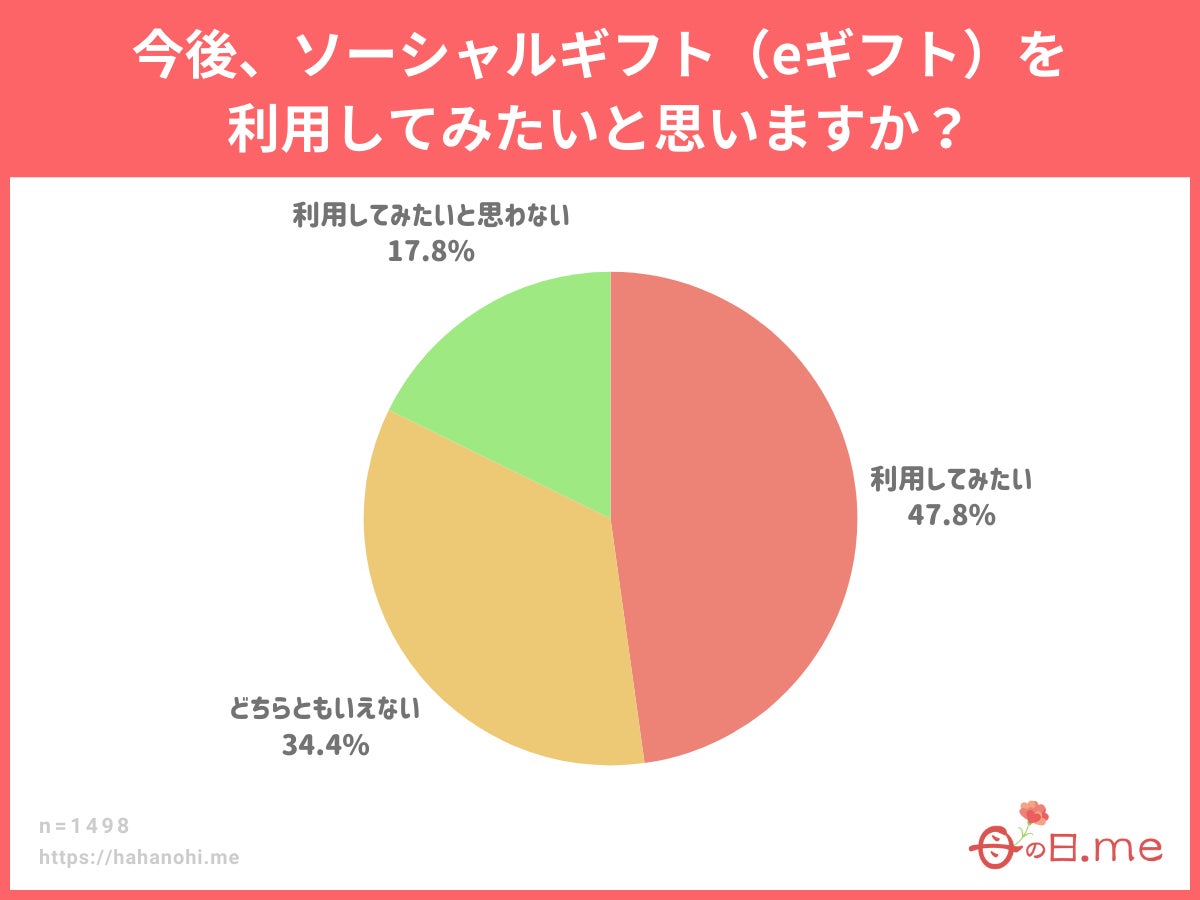 また、ソーシャルギフトの利用意向も高まっており、「利用してみたい」と考えている人の割合は2024年の42.9%から2025年には47.8%へと増加しています。約半数の人がソーシャルギフトに前向きな姿勢を示しており、今後のさらなる利用拡大が期待されます。