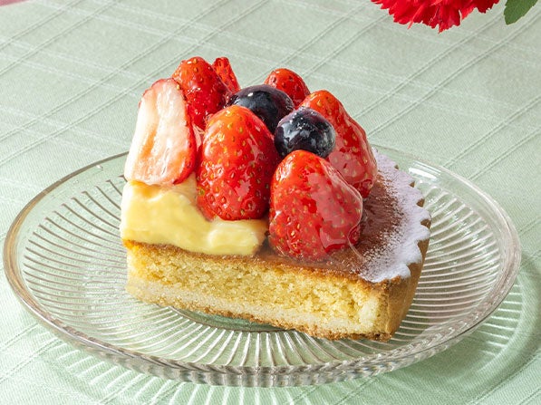 アーモンドクリームを入れて焼き上げたタルト台にカスタードクリームを絞り、苺・ブルーベリーを飾りました。