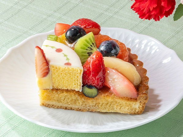 アーモンドクリームを入れて焼き上げたタルト台に7種類のフルーツをトッピングし、バウムクーヘンを飾った母の日限定の華やかなタルトです。(白桃・白桃グレナデンシロップ漬け・オレンジ・ルビー・キウイ・苺・ブルーベリー)※稀にフルーツの種が入っている場合がございます。