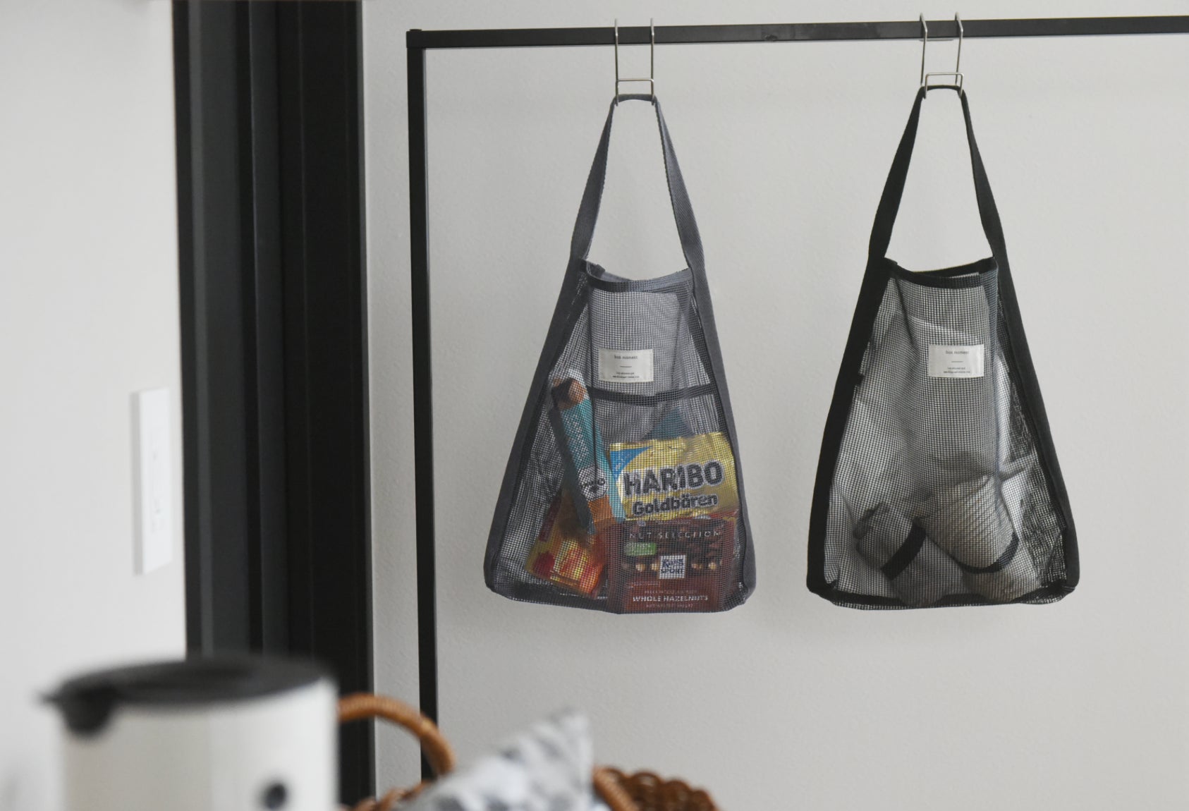 玉ねぎなど常温野菜の保存、洗った水筒やペットボトルの乾燥。ラップやアルミホイルの収納や、袋類の収納にも。通気性の良さと程よい目隠し効果で、キッチンまわりでマルチに活躍するメッシュバッグができました。