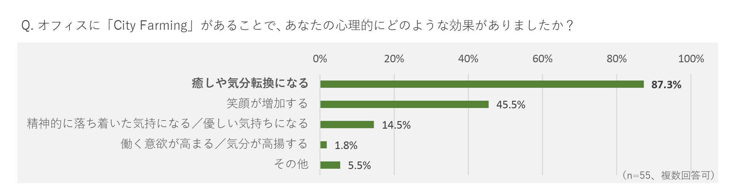 オフィスへの「City Farming」の導入により、コミュニケーション活性化、従業員のオフィス環境に対する総合的な満足度の向上、健康経営の実現といった効果が期待できます。