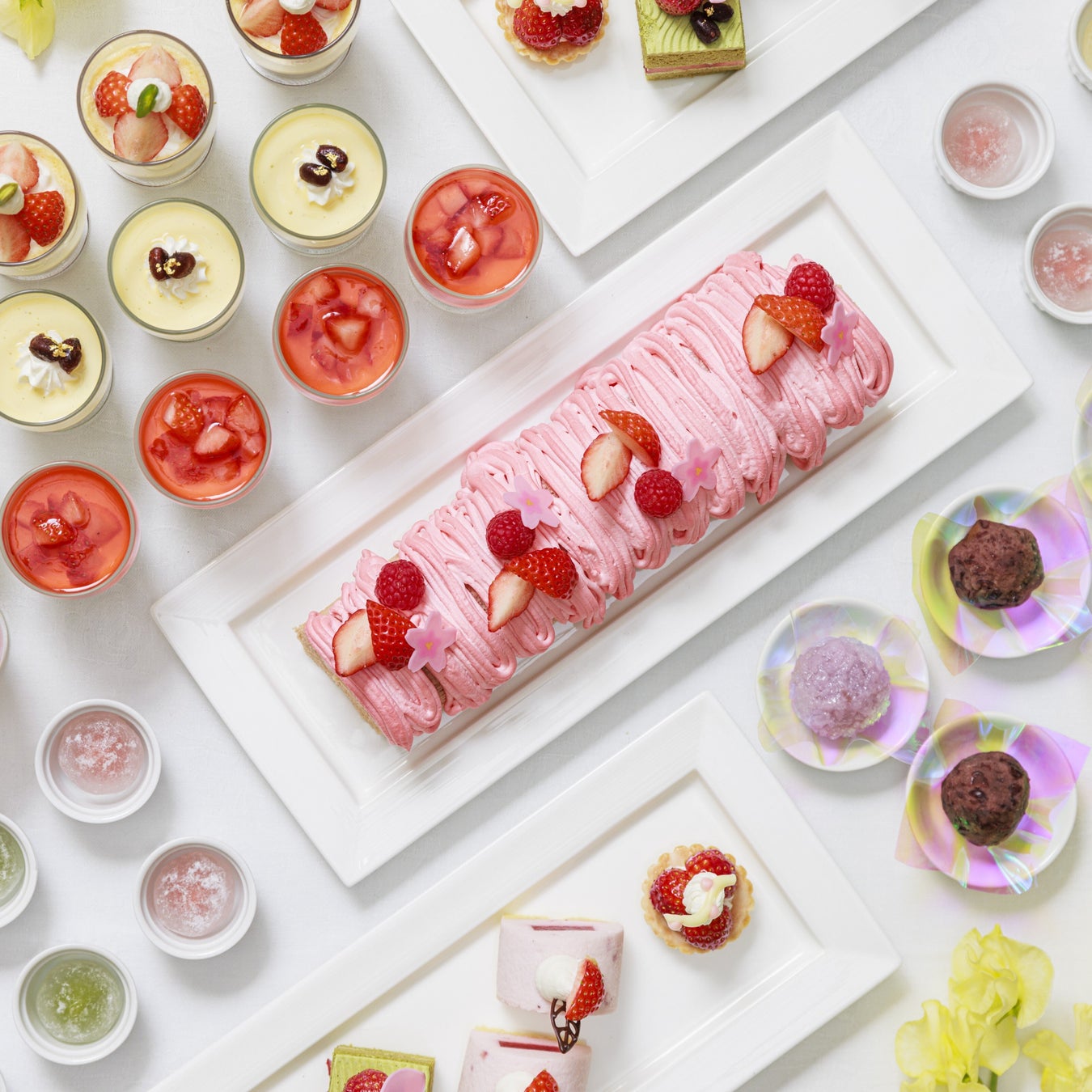 苺のモンブランロール/苺のレアチーズケーキ/抹茶のショートケーキ/桜パンナコッタ/プリン/おはぎ/桜餅/ストロベリーチョコレートファウンテン/フルーツ/ソフトドリンク各種