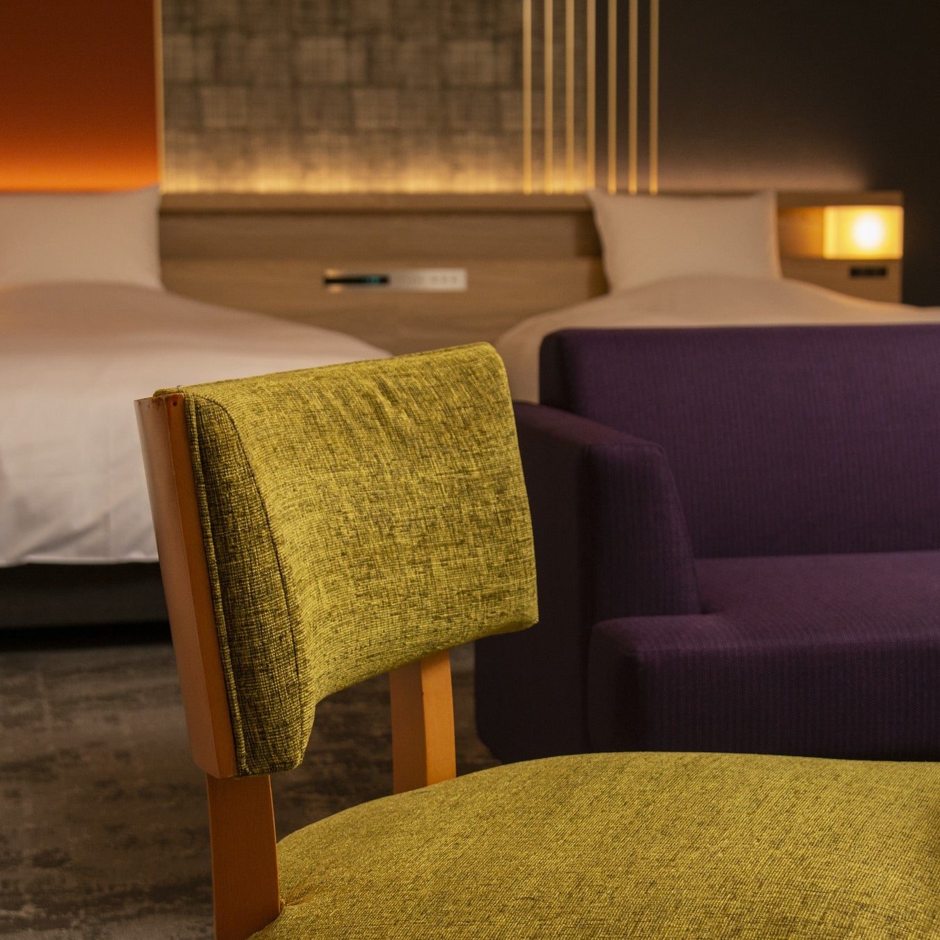 「武家屋敷」をコンセプトに、安らぎを感じられる和を取り入れたシンプルモダンなデザイン。加賀友禅に用いられる加賀五彩の華やかさをプラスしました。伝統的な色彩が奥ゆかしく、ゆったりとしたお時間をお過ごしいただけます。 70平米のラグジュアリースイートや、トリプル仕様にも変化し3名様でのご宿泊が可能なツインプラスのお部屋が家族旅行や女子旅に人気。