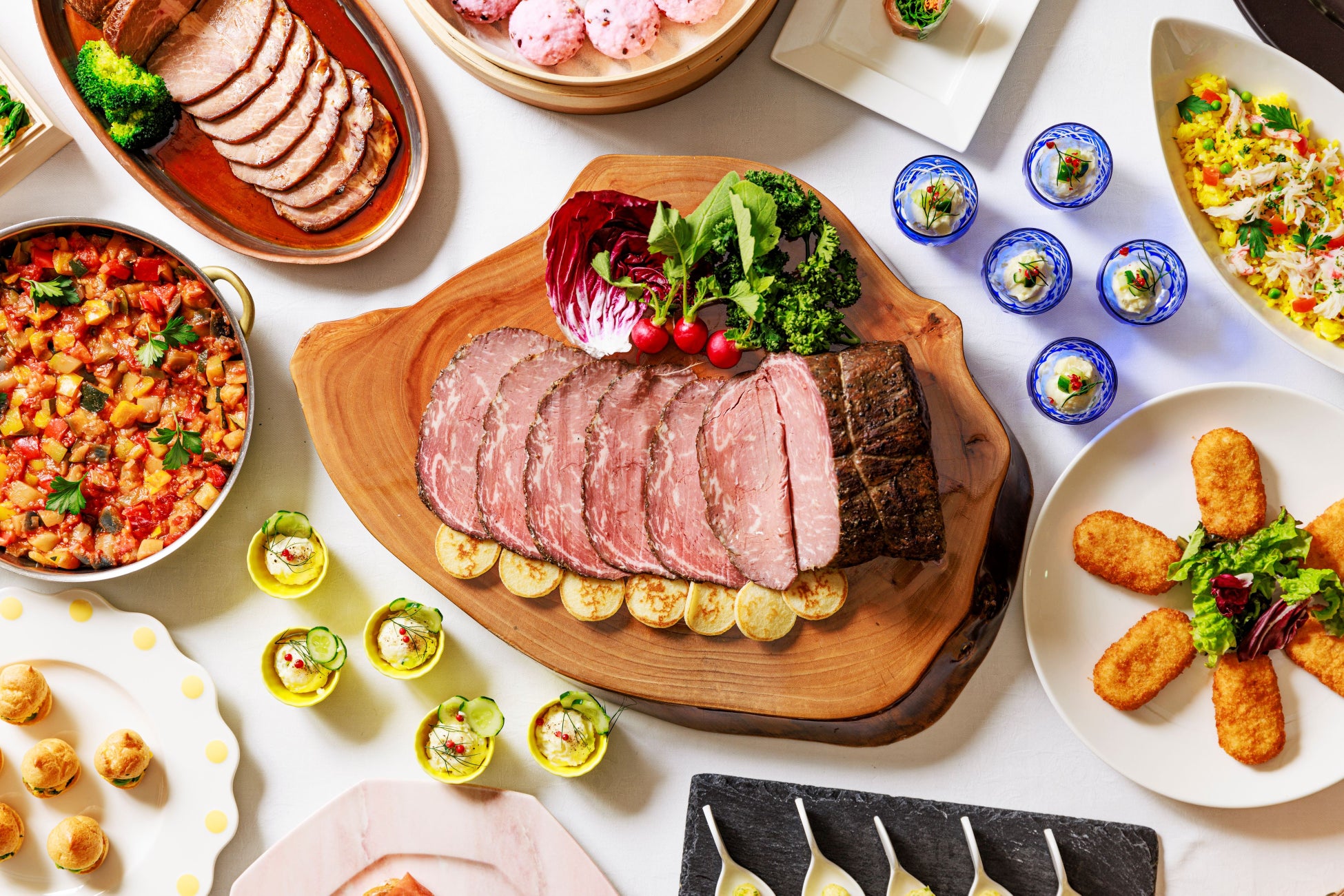 〈温製料理〉えんどう豆のスープまたはチキンコンソメスープ/サラダプランタニエール/ラタトゥイユ 季節の野菜/生ハム巻きガーリックトースト/菜の花のスクランブルエッグ シュー包み/カニクリームコロッケ/さくら焼売・錦糸焼売 または しらす饅頭・穴子の饅頭/たけのこのフリット/チキンロールピザ風/能登豚肩肉のつや煮/カレーピラフ/ローストビーフ 和風マスタードソース
