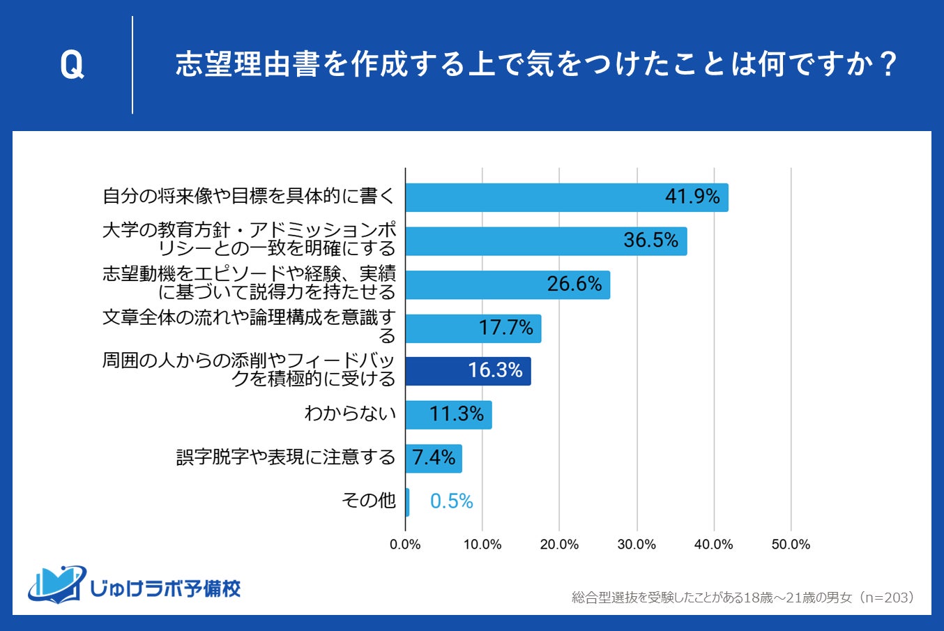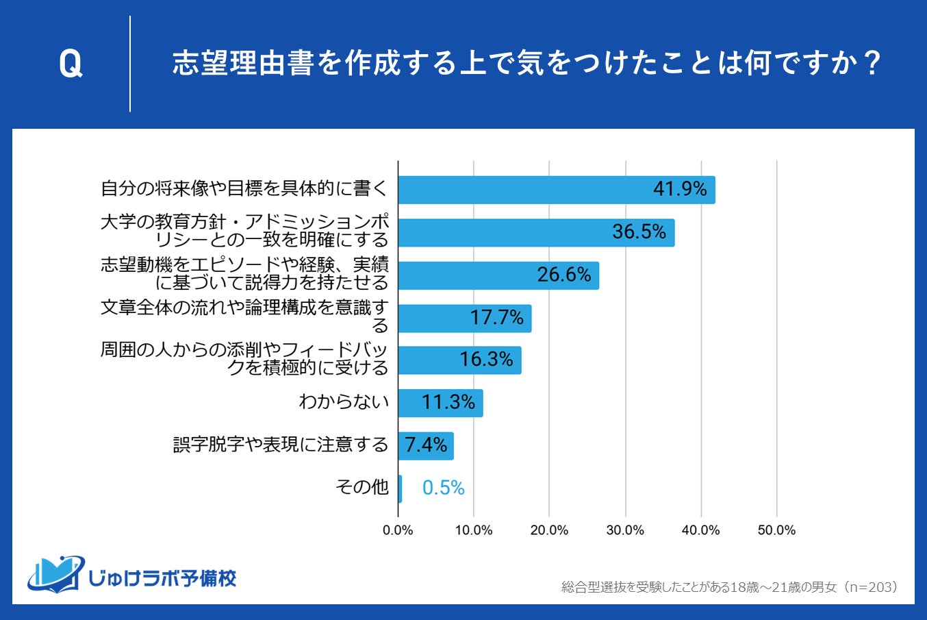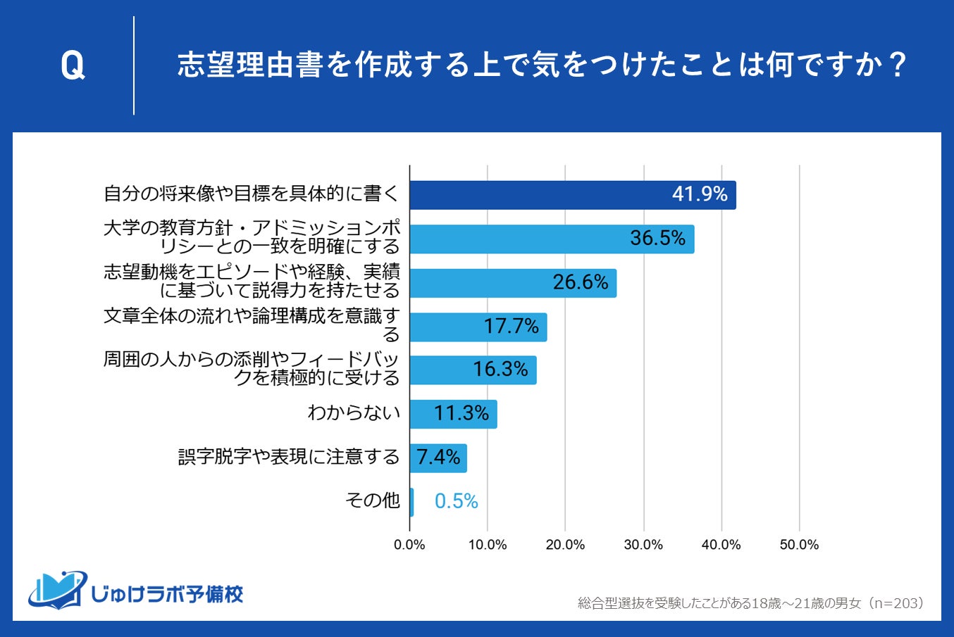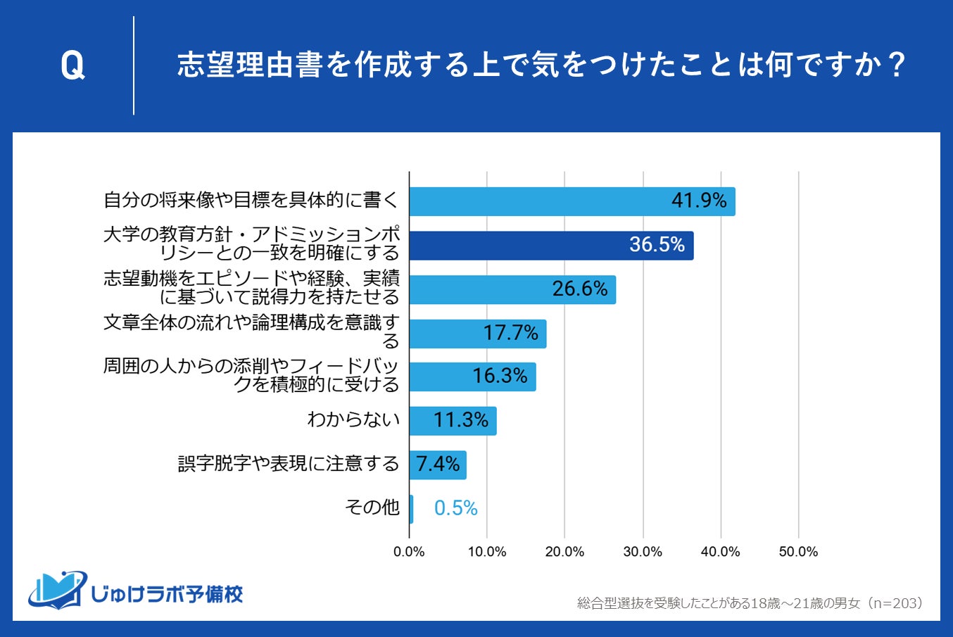 次いで36.5%の受験生は、大学の教育方針やアドミッションポリシーとの一致を明確にすることに留意しています。この結果は、各大学が掲げる理念や求める人物像とのマッチングを図るため、受験生が自らの経験や価値観を大学側の期待に合わせる努力をしていることを示唆しています。大学側の評価基準に沿った内容を盛り込むことで、志望理由書全体の説得力を高め、合格の可能性を拡大しようとする受験生の戦略が浮き彫りとなりました。